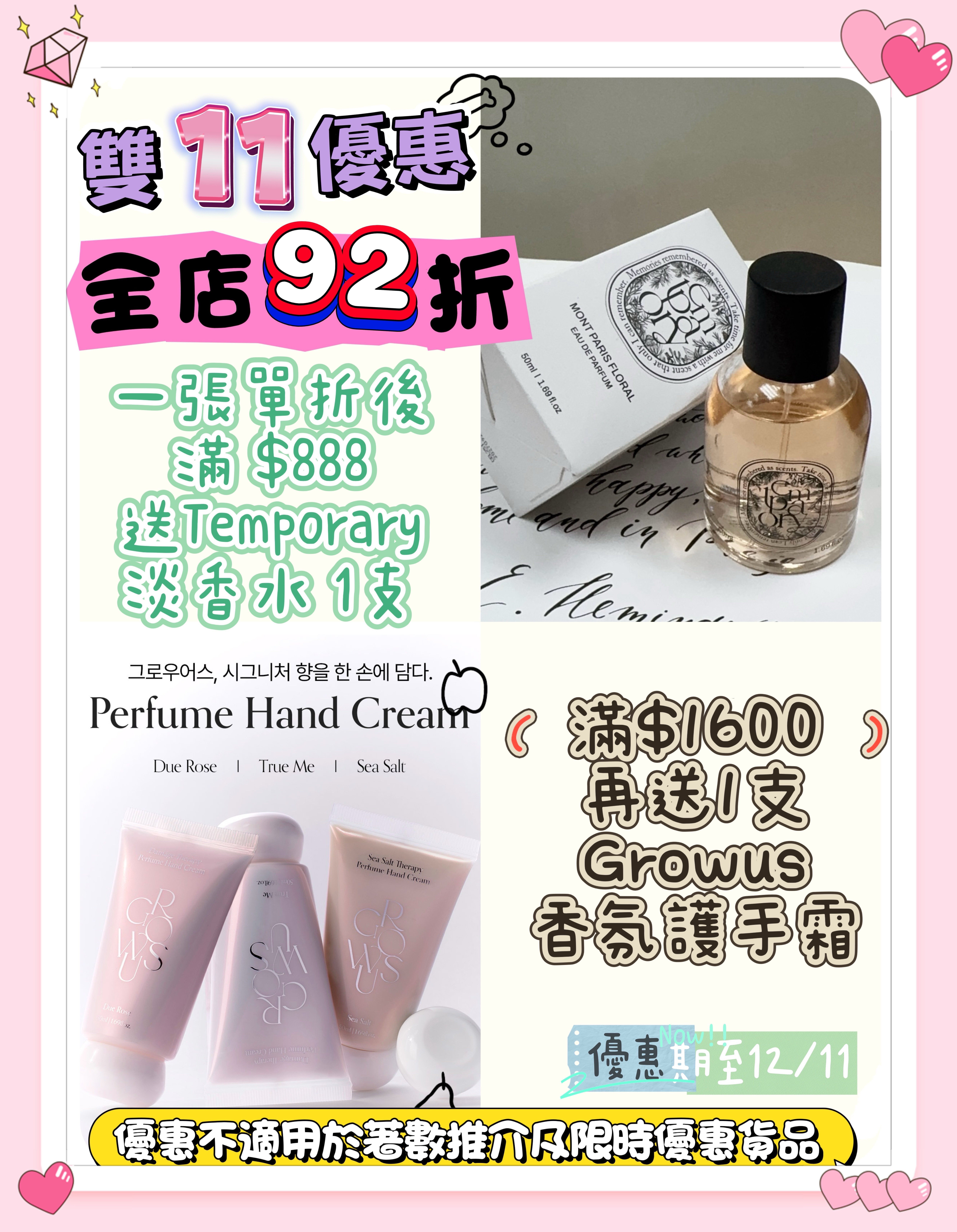 踏入11月就快到雙11🎊🎊 梗係要做下優惠等大家Happy Shopping🥳 除左有92折優惠 仲有雙重禮物送比大家🎁🎁 一張單折後滿$888 送Temporary淡香水1支(價值$139)🌺 買滿$1600再送多1支Growus護手霜(價值$109)👍 淨係2️⃣份禮物都要二百幾蚊 係咪好正呢🥰 ⌛優惠期至11月12日⌛