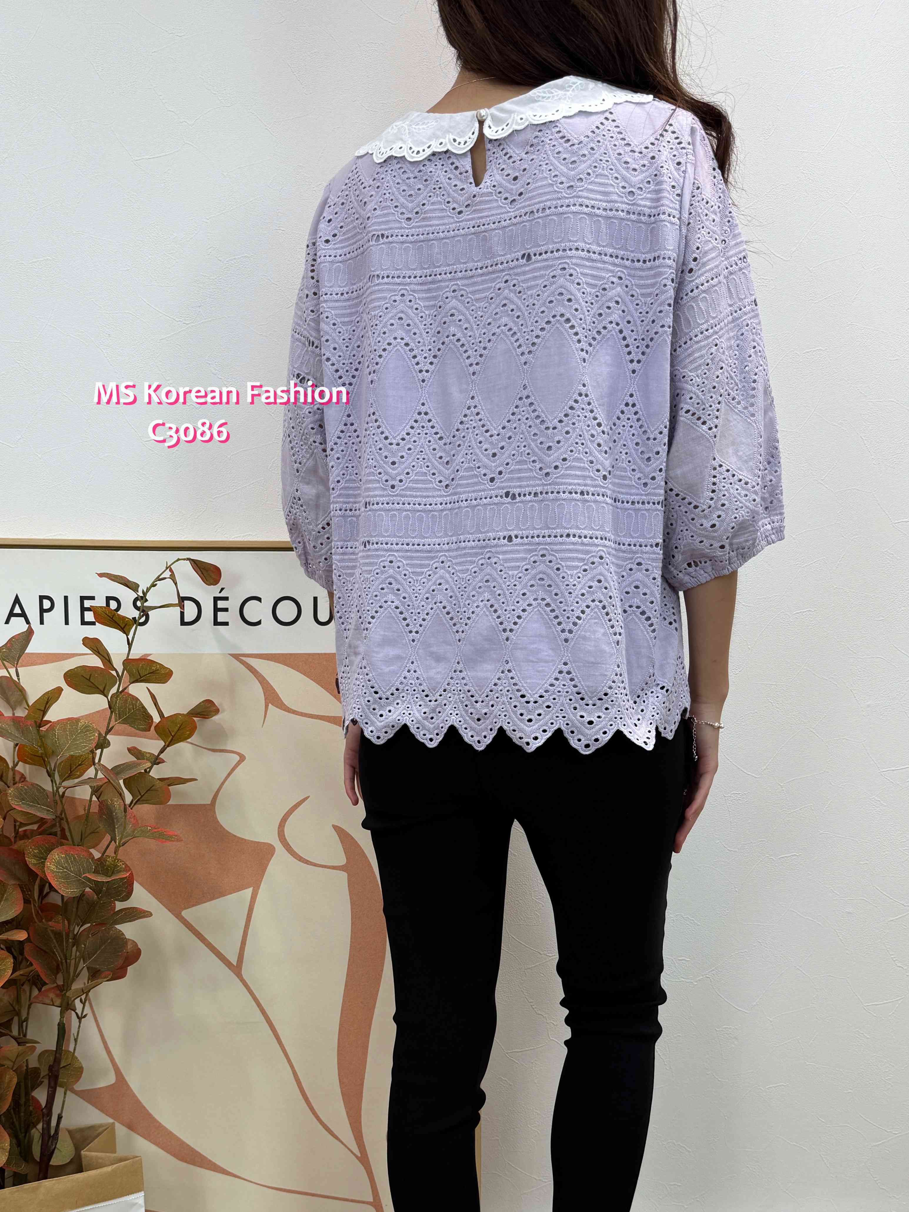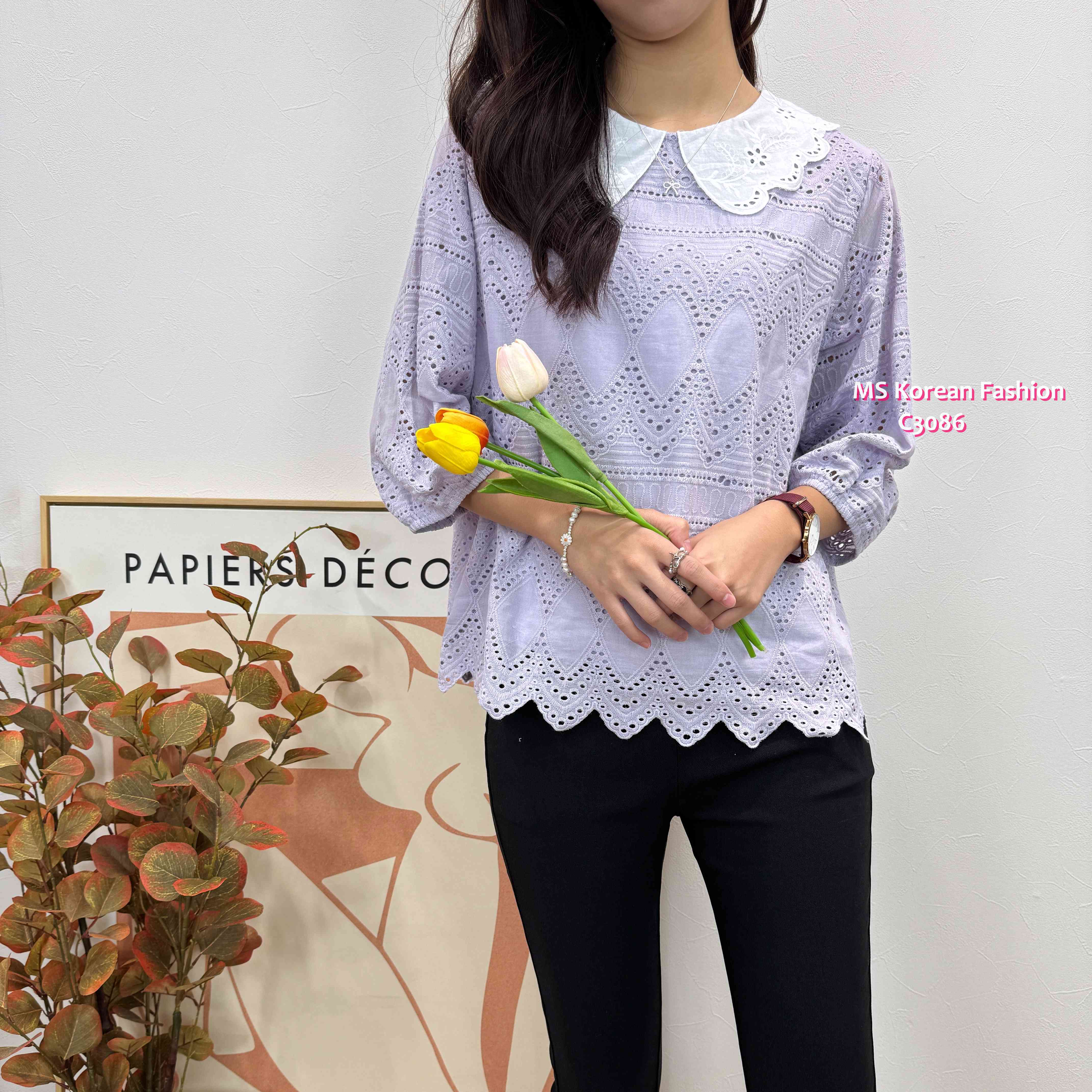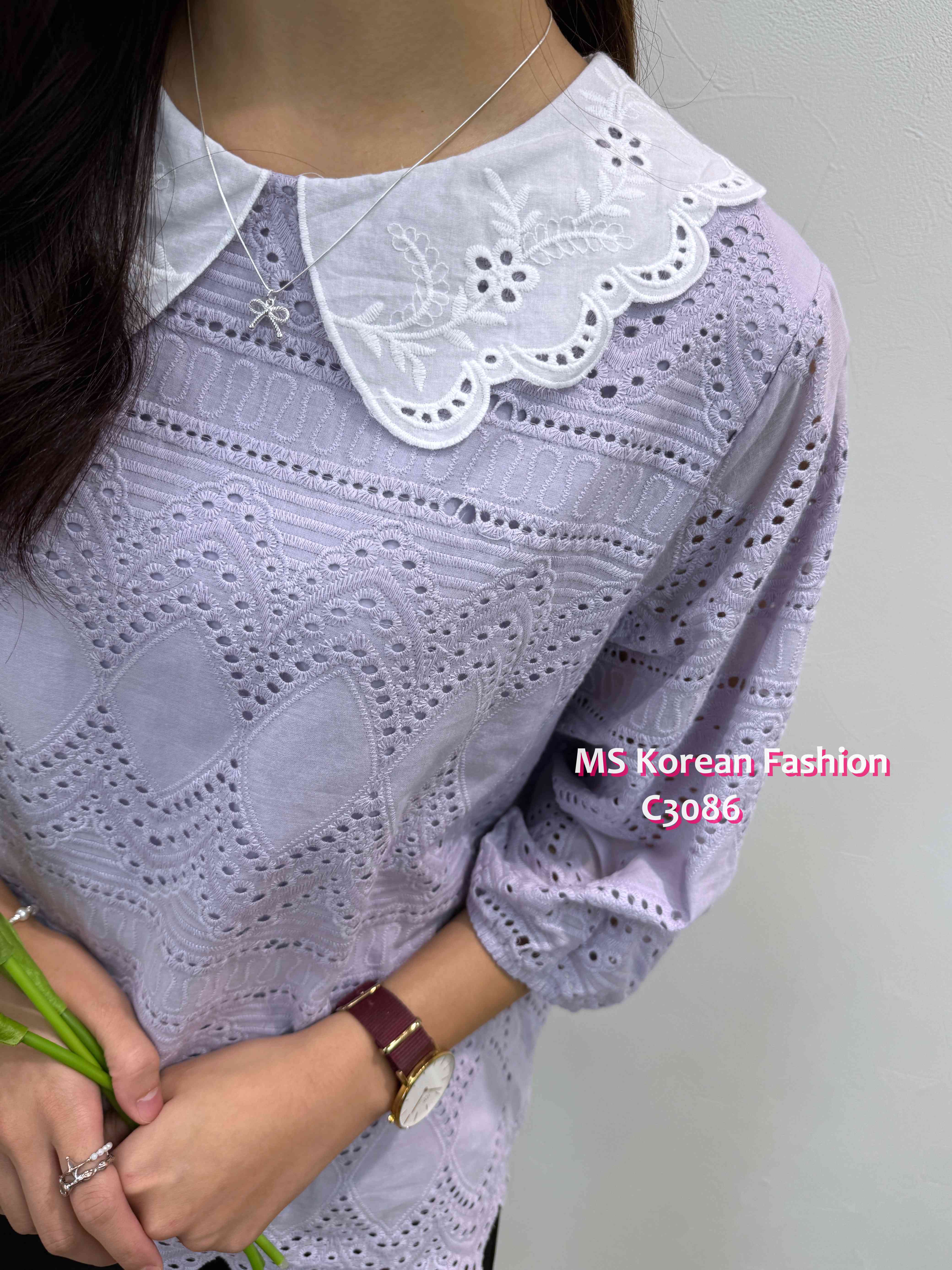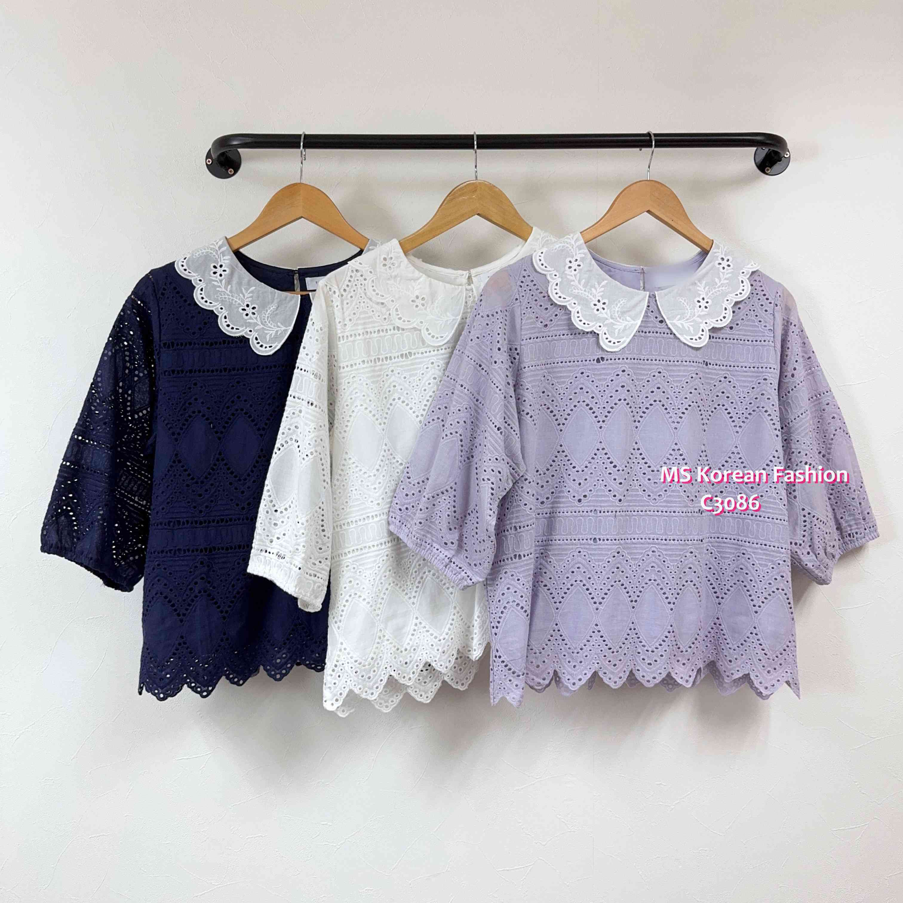 [訂貨約7-10個工作天] 💰💞Happy Price: $189 波浪腳通花top😻 通花pattern巧令令🌺 紫色同寶藍做左拼色領設計個款出D 想低調D可以揀全白色🤍 衫身有內里白色都唔怕透 寶藍、白、紫 3色 尺寸 肩15"/胸43"/長23.5" 📫1件加$15包順豐站/智能櫃,2件包順豐(順豐站/智能櫃/工商/住宅) 📱查詢及Order可Inbox或Whatsapp 6317 3061