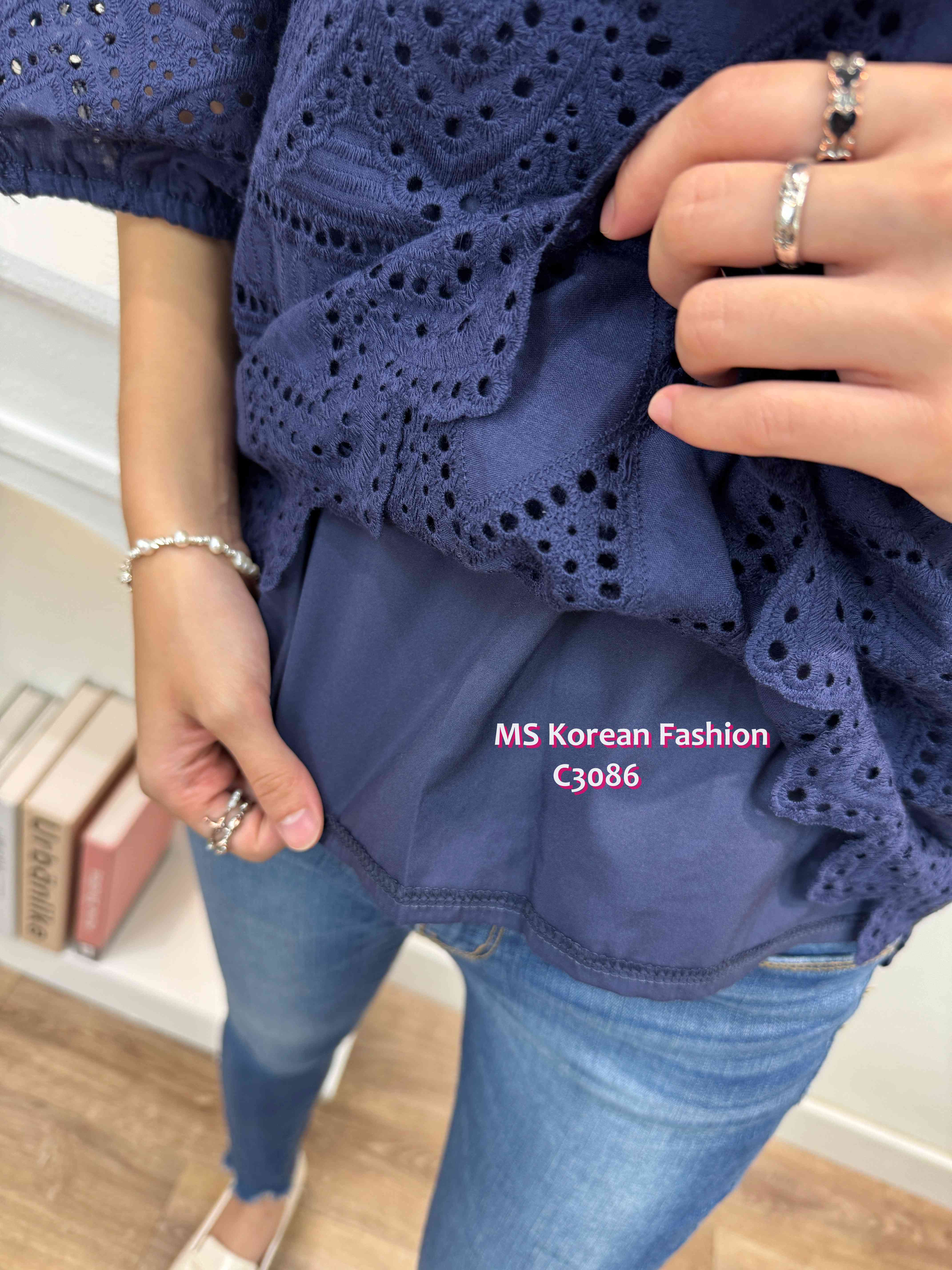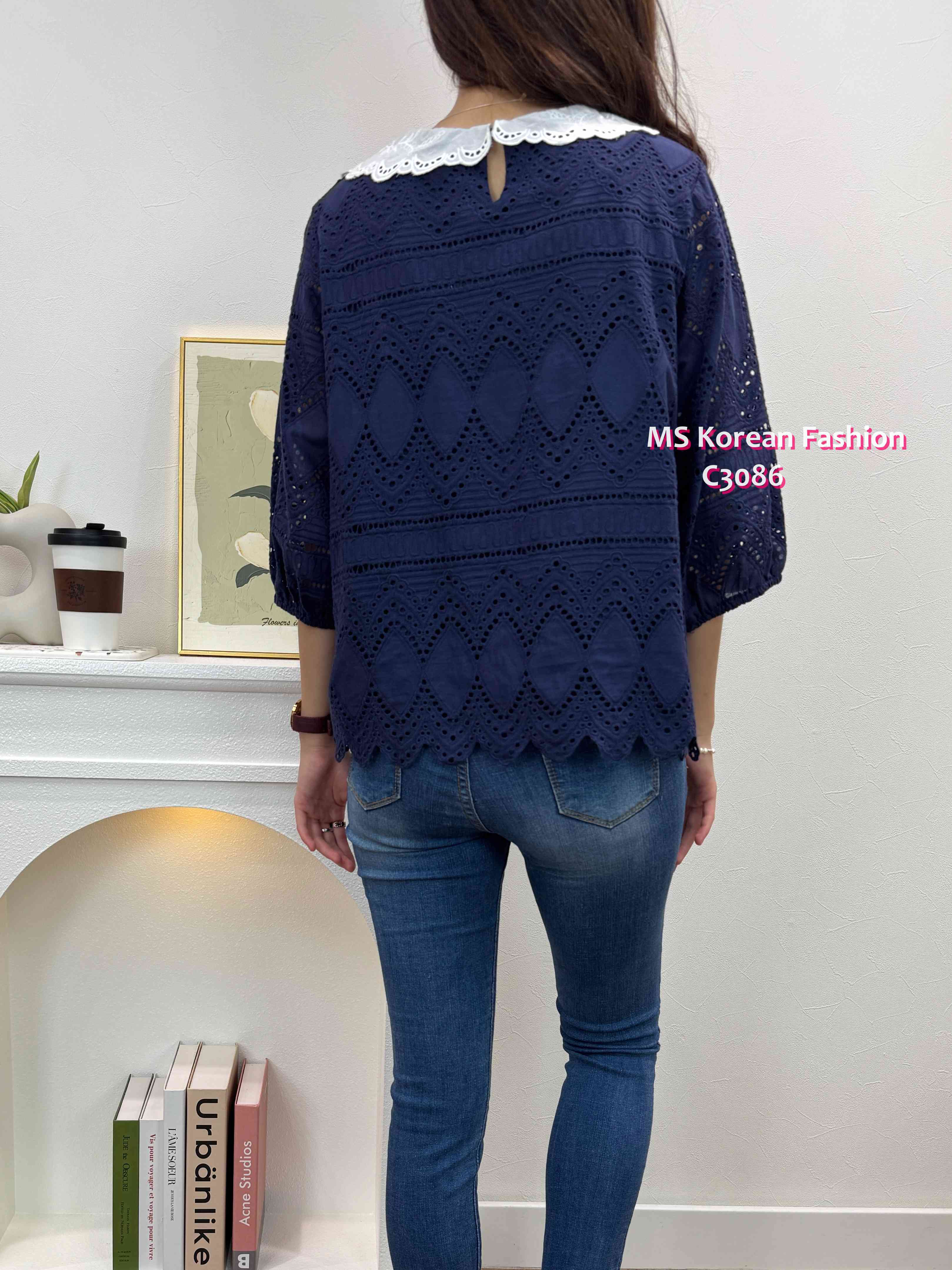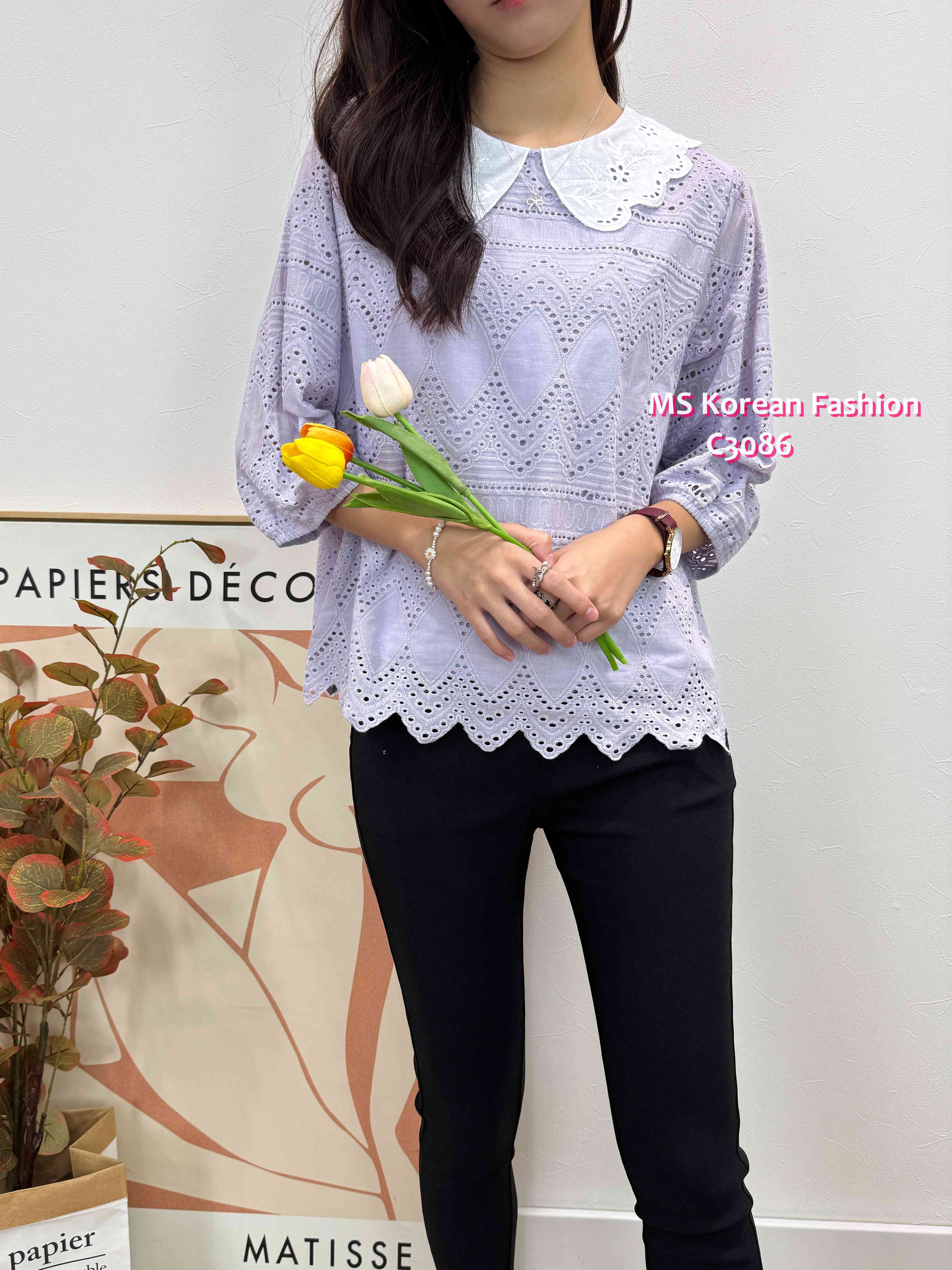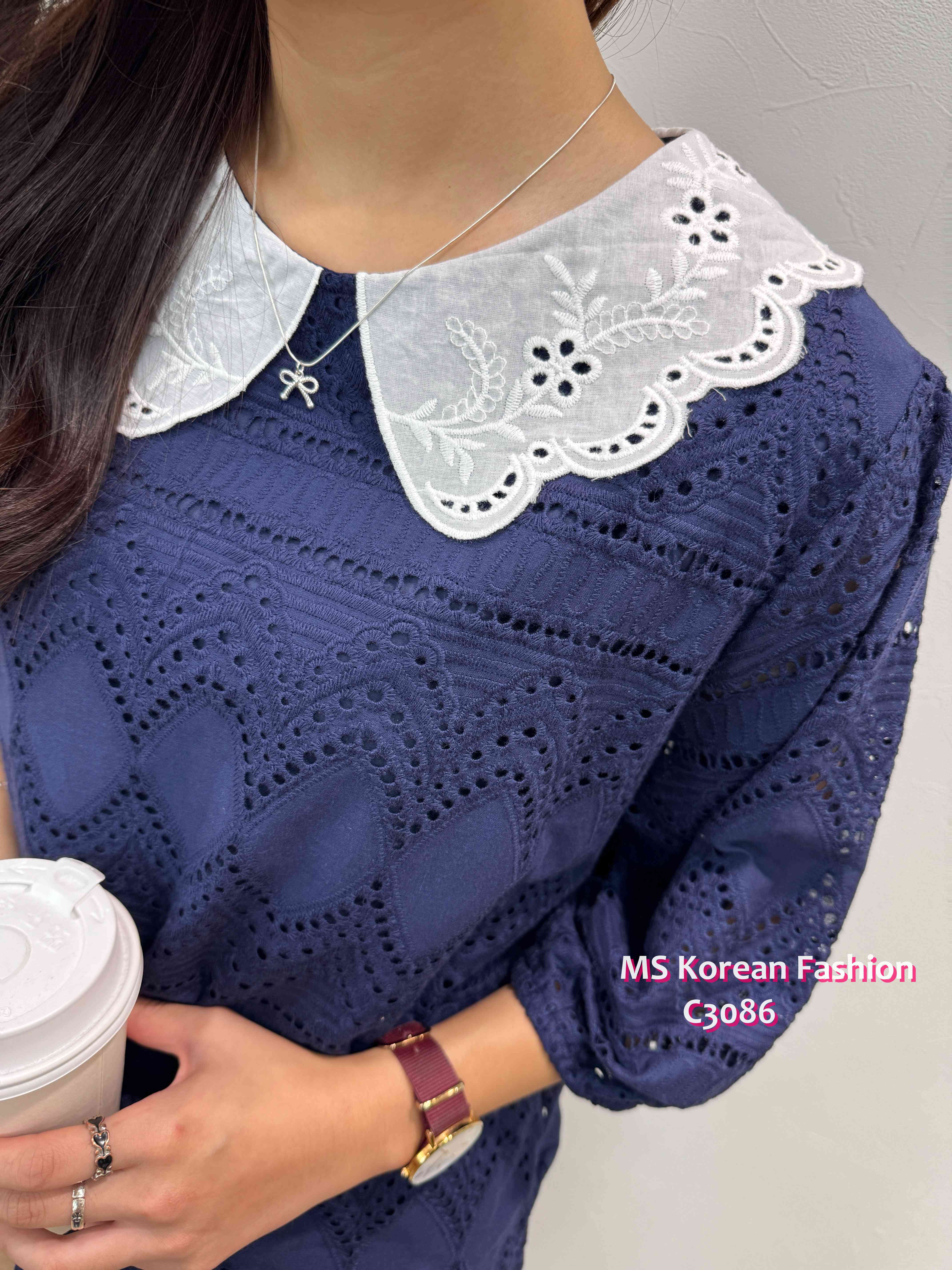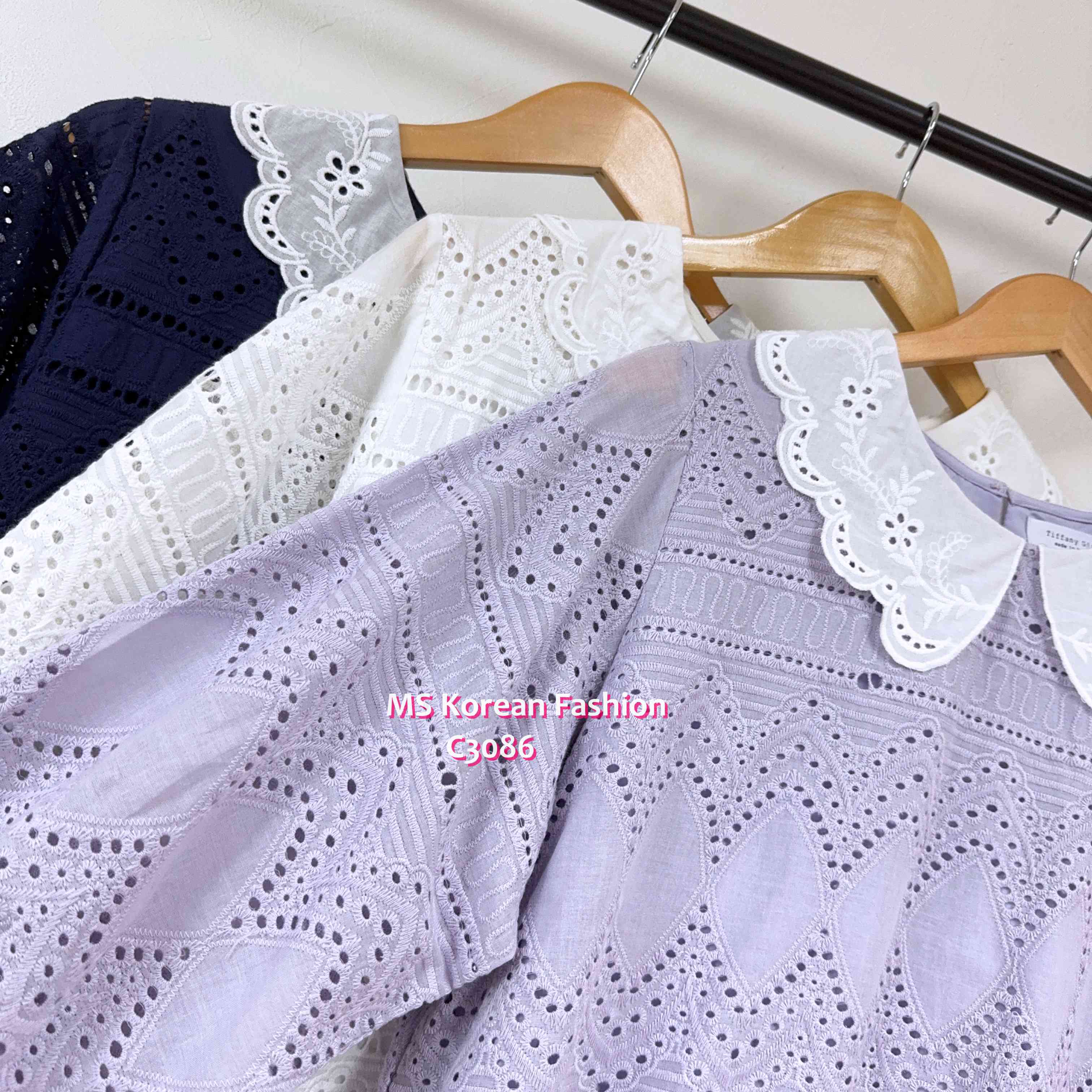 [訂貨約7-10個工作天] 💰💞Happy Price: $189 波浪腳通花top😻 通花pattern巧令令🌺 紫色同寶藍做左拼色領設計個款出D 想低調D可以揀全白色🤍 衫身有內里白色都唔怕透 寶藍、白、紫 3色 尺寸 肩15"/胸43"/長23.5" 📫1件加$15包順豐站/智能櫃,2件包順豐(順豐站/智能櫃/工商/住宅) 📱查詢及Order可Inbox或Whatsapp 6317 3061