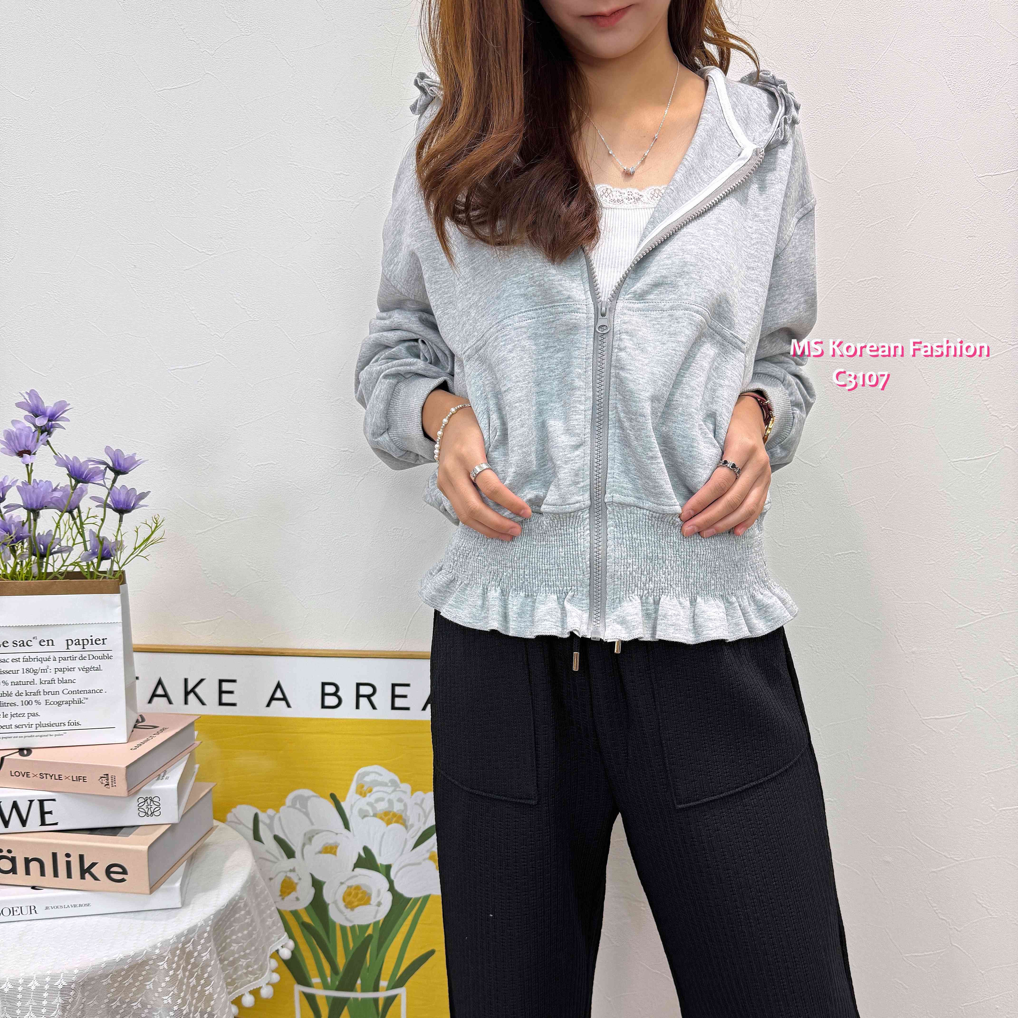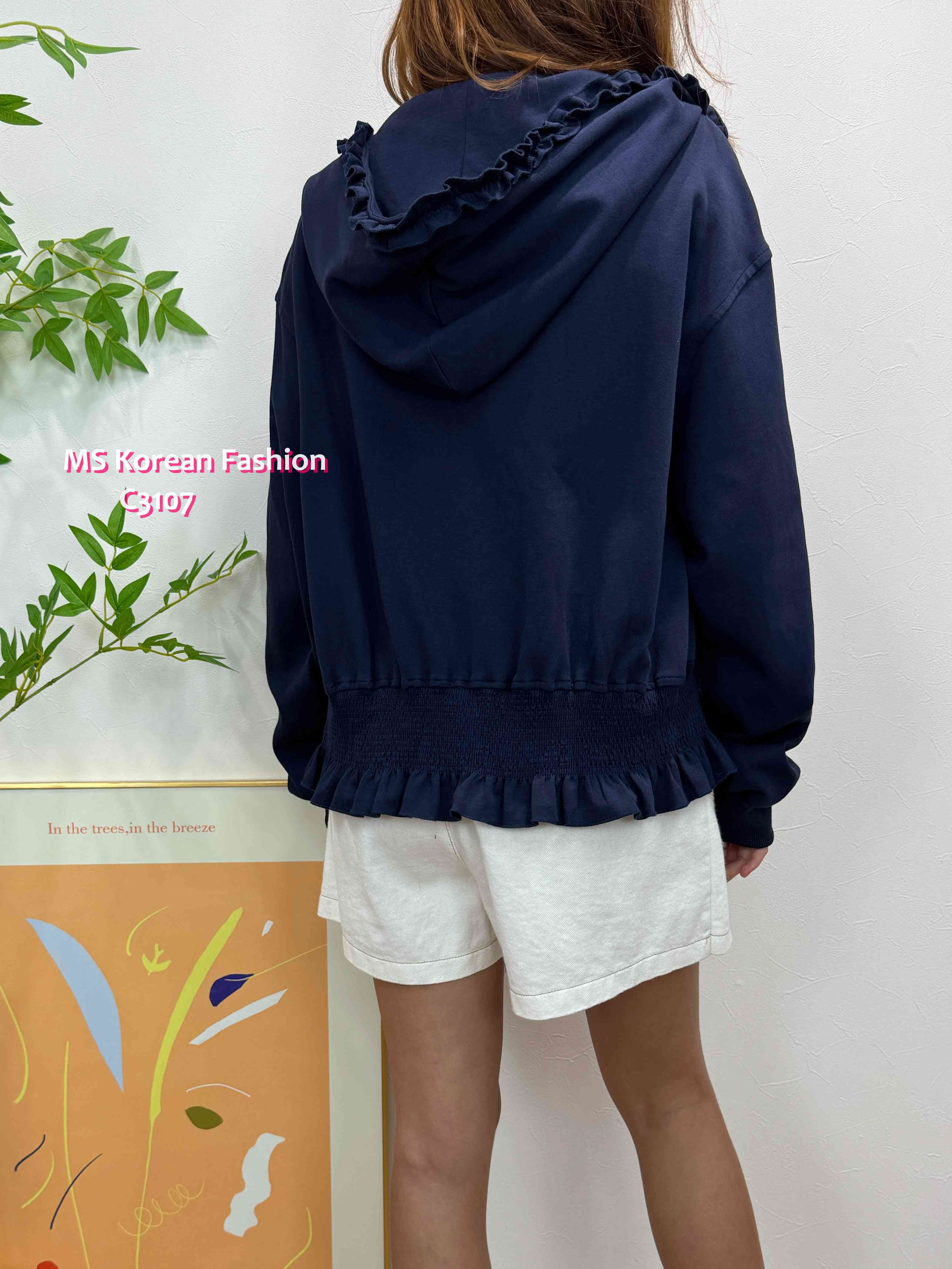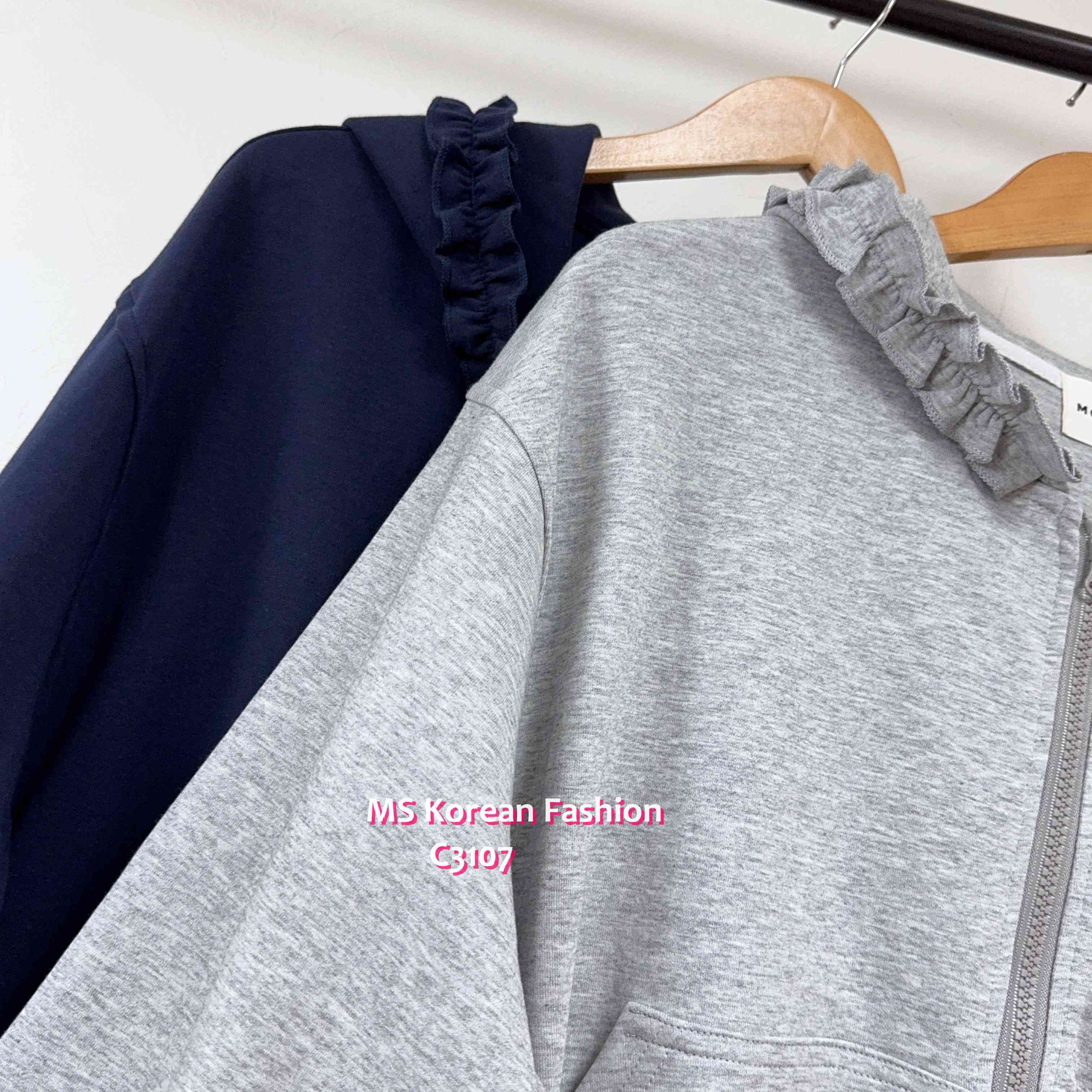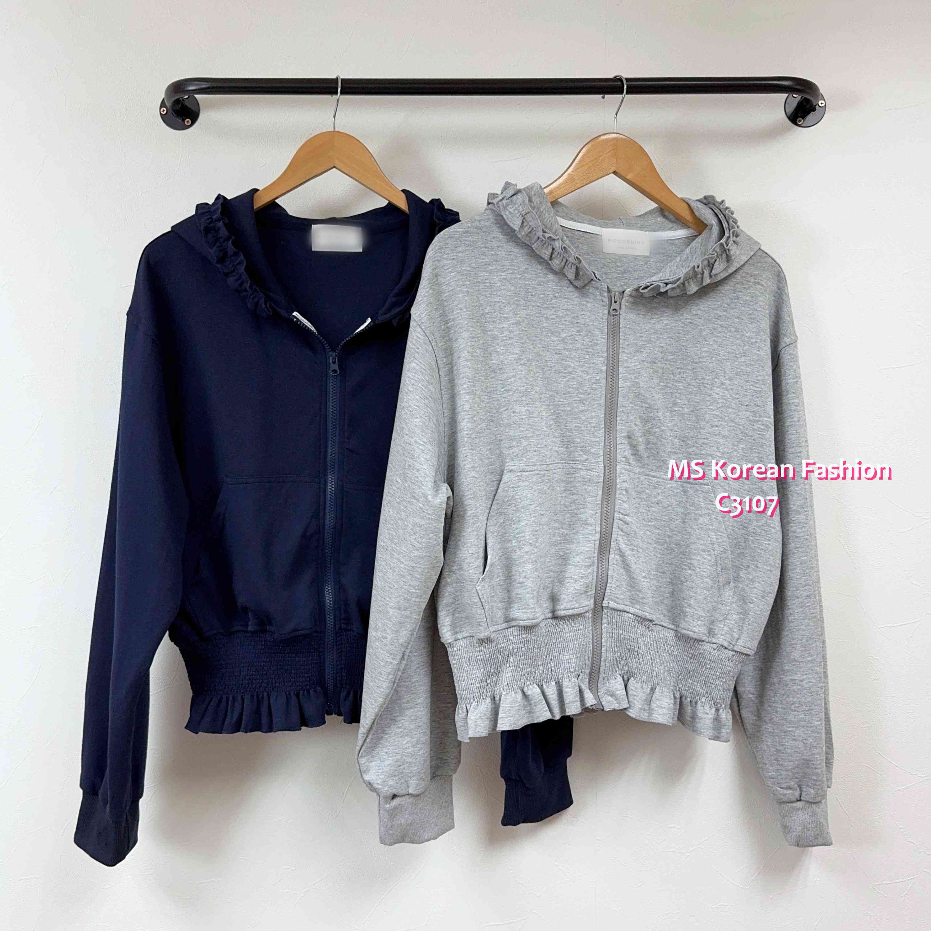 C3107 韓國🇰🇷ruffle邊有帽拉鏈外套