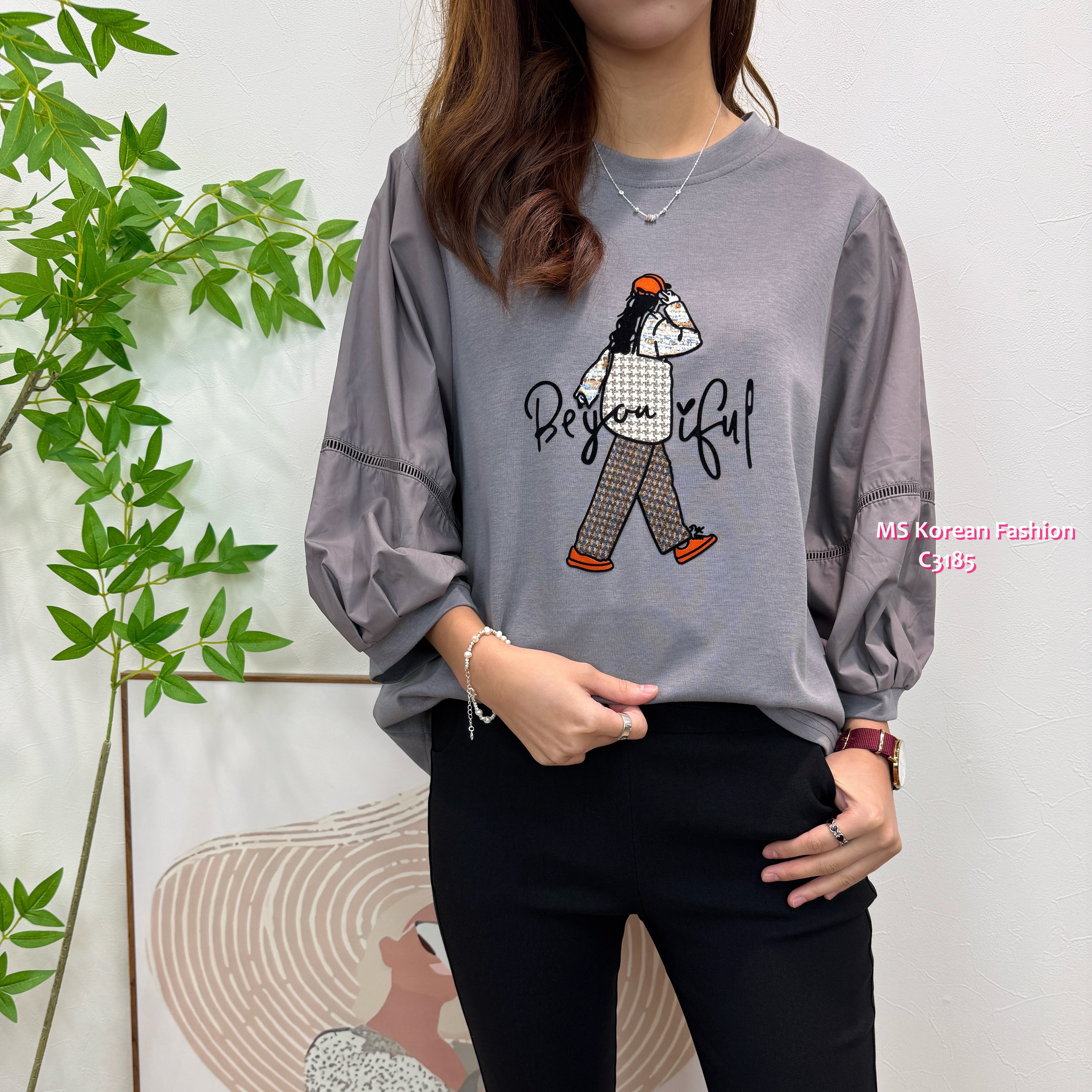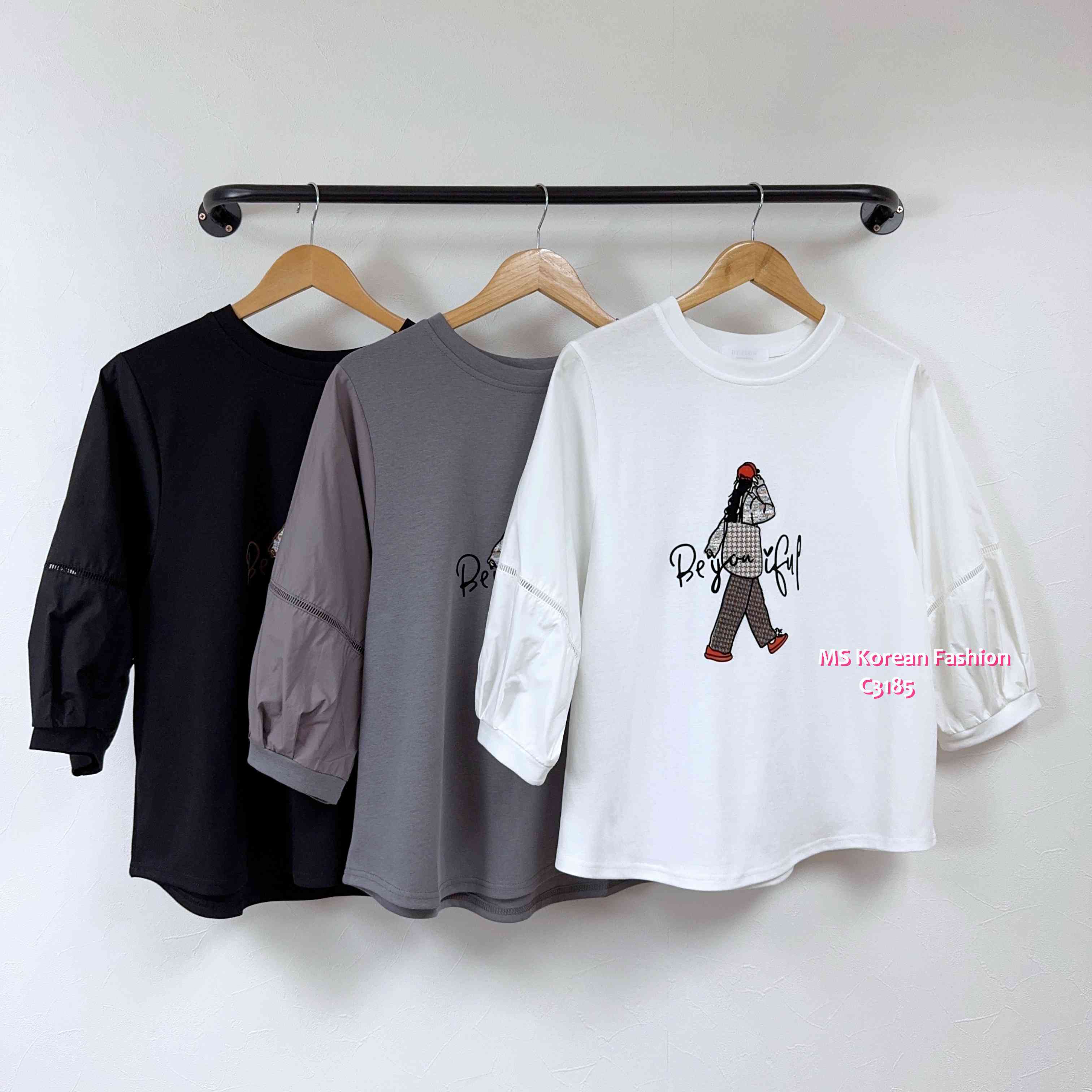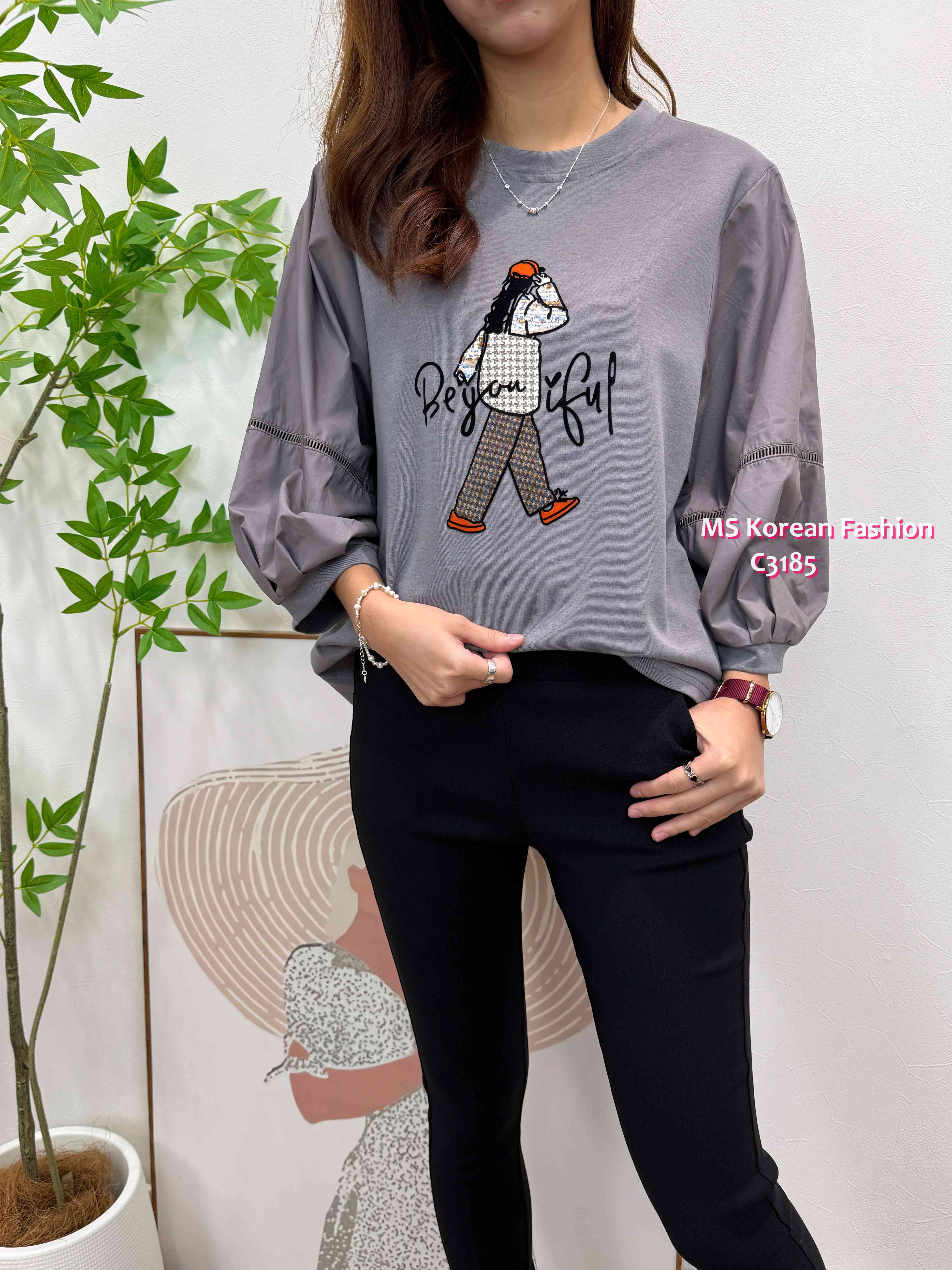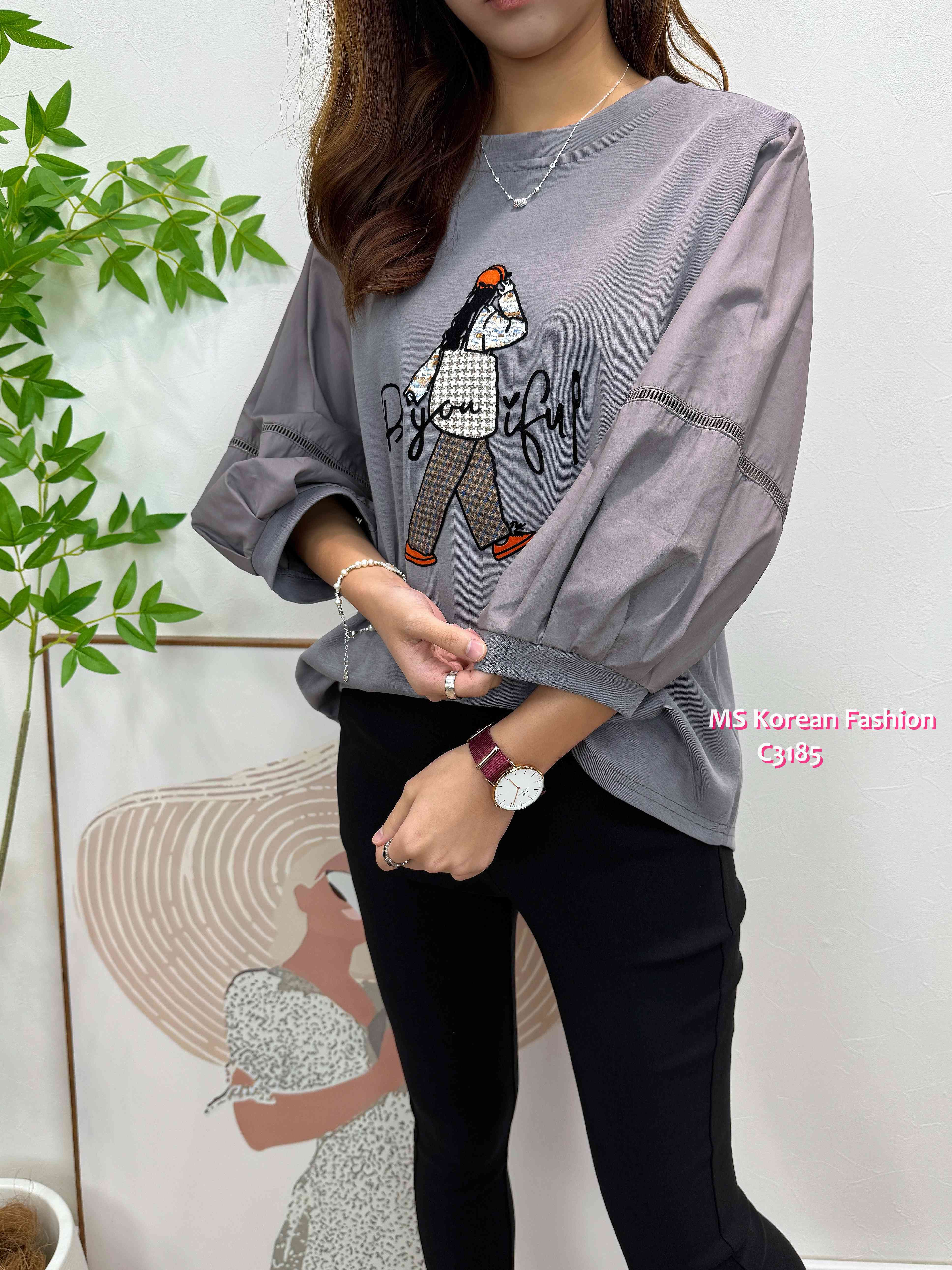 [訂貨約7-10個工作天] 💰💜$189, $179 for vip 靚print泡泡袖top🥰 挺身棉料拼恤料袖 鬆鬆地肥瘦都carry到👍 3️⃣色各有捧埸客💖 黑、灰、白 3色 尺寸 肩16"/胸42"/長24.5" 📫1件加$15包順豐站/自助櫃,2件包順豐(順豐站/自助櫃/工商/住宅) 📱查詢及Order可Inbox或Whatsapp 6317 3061