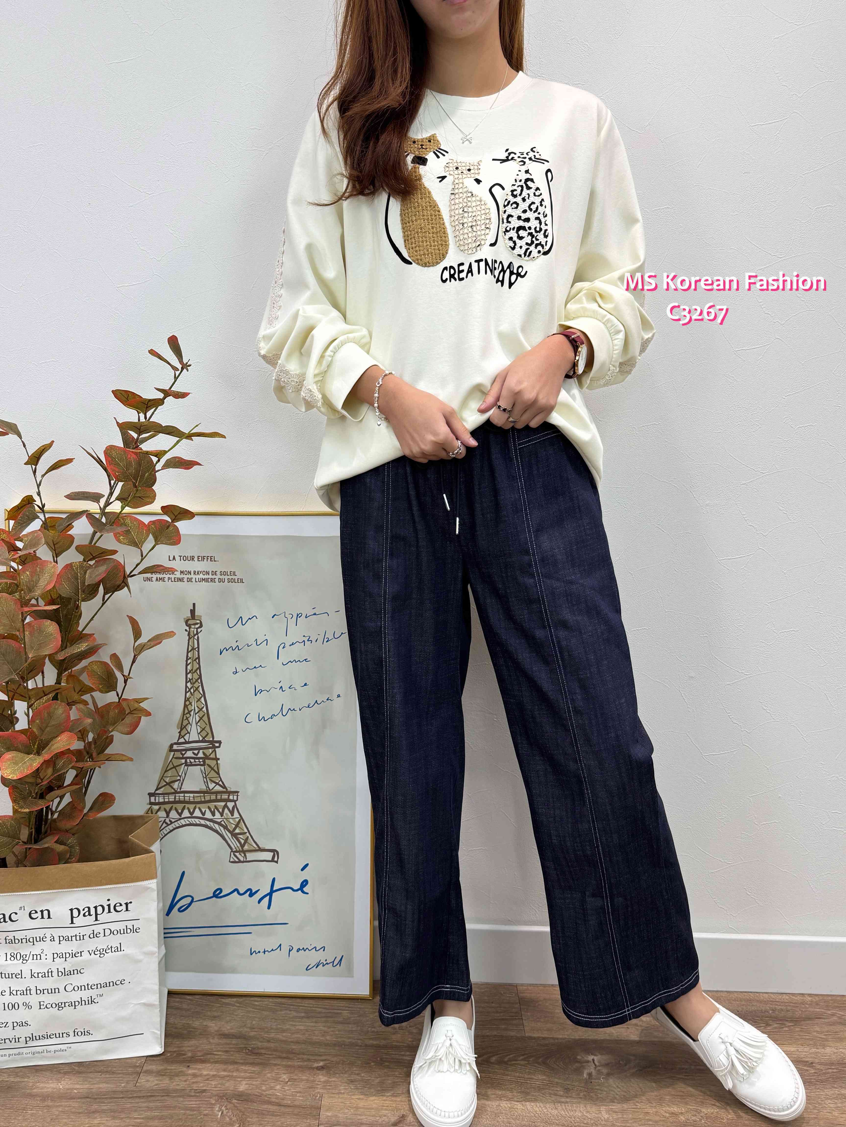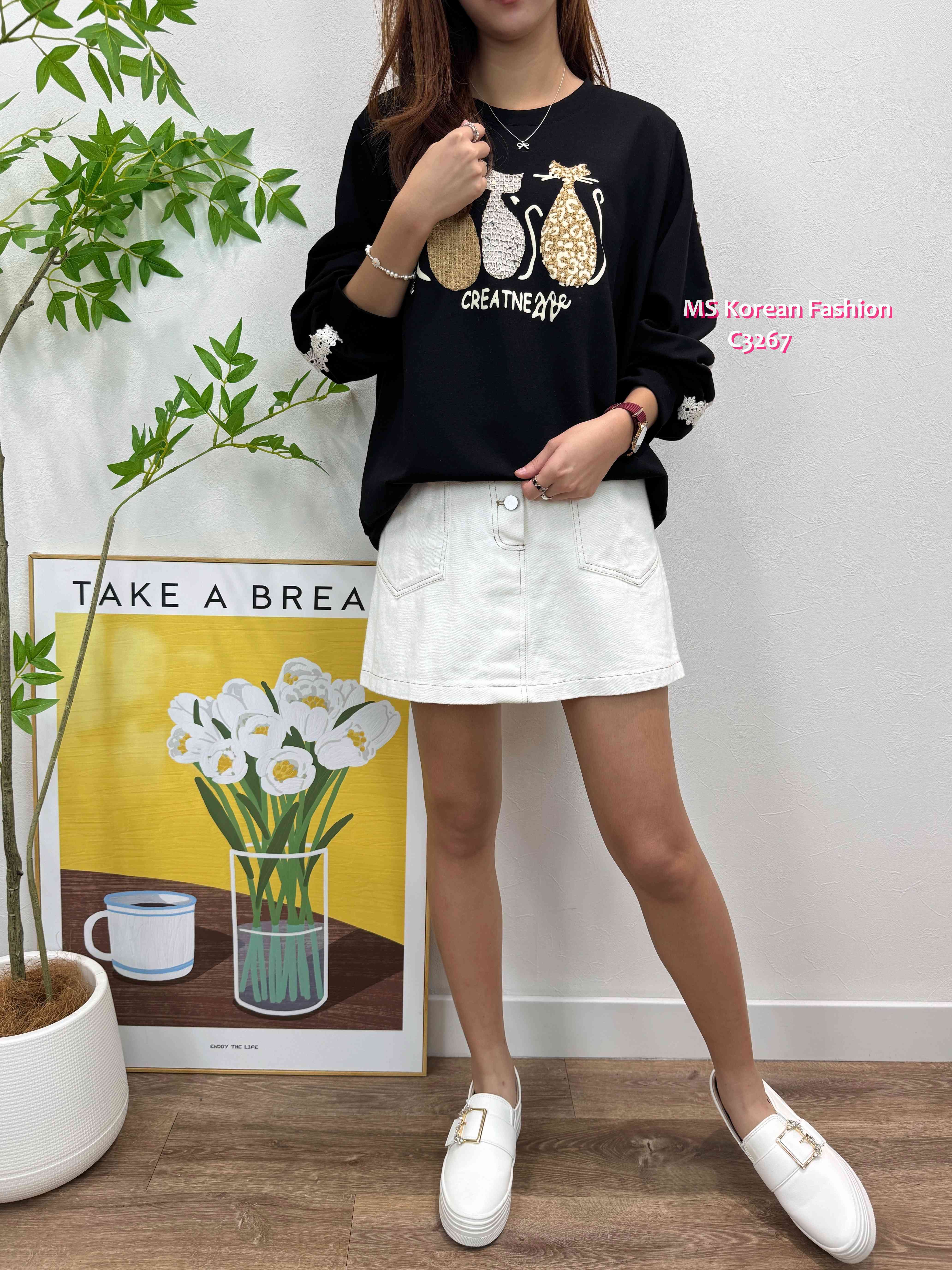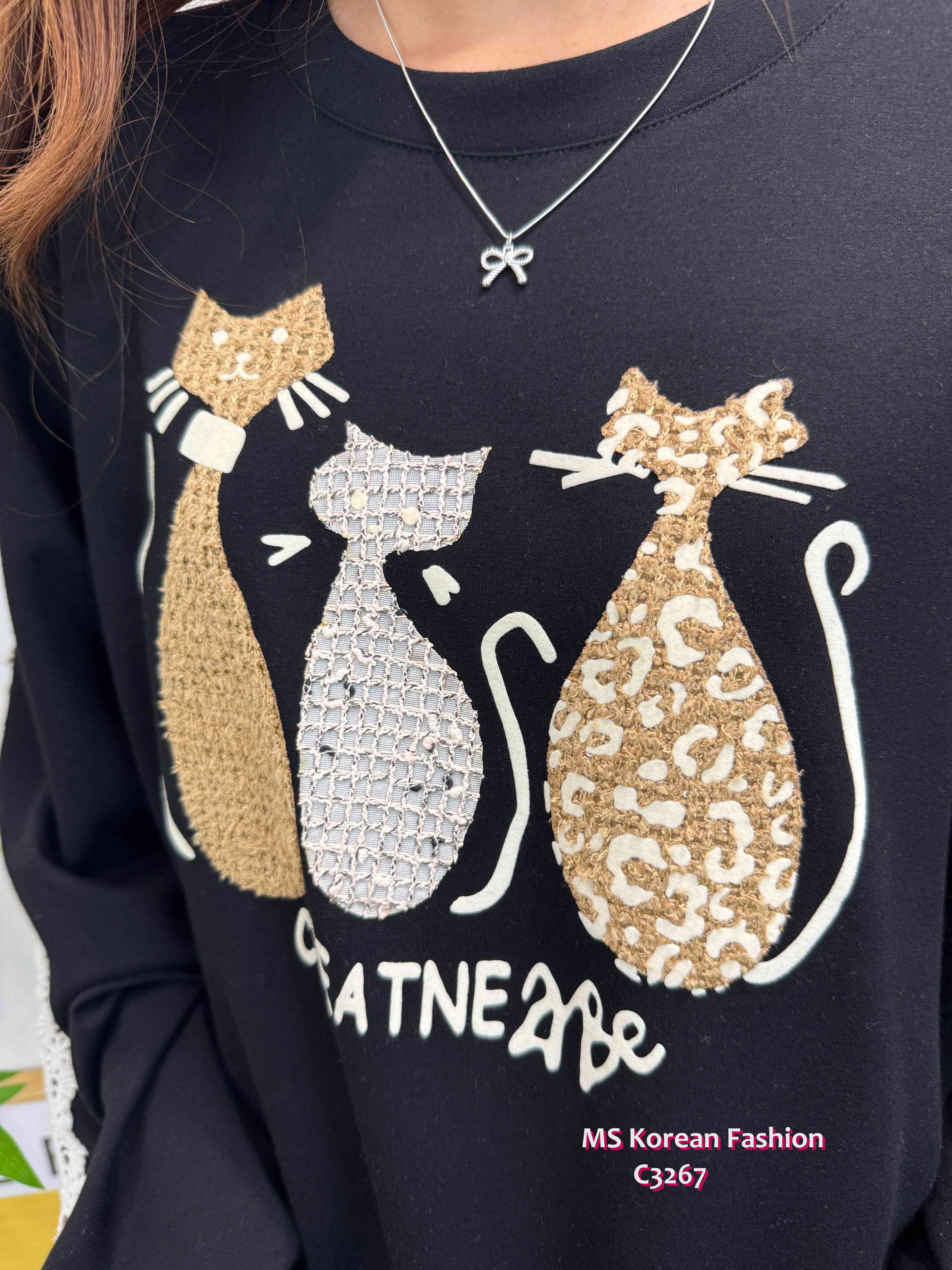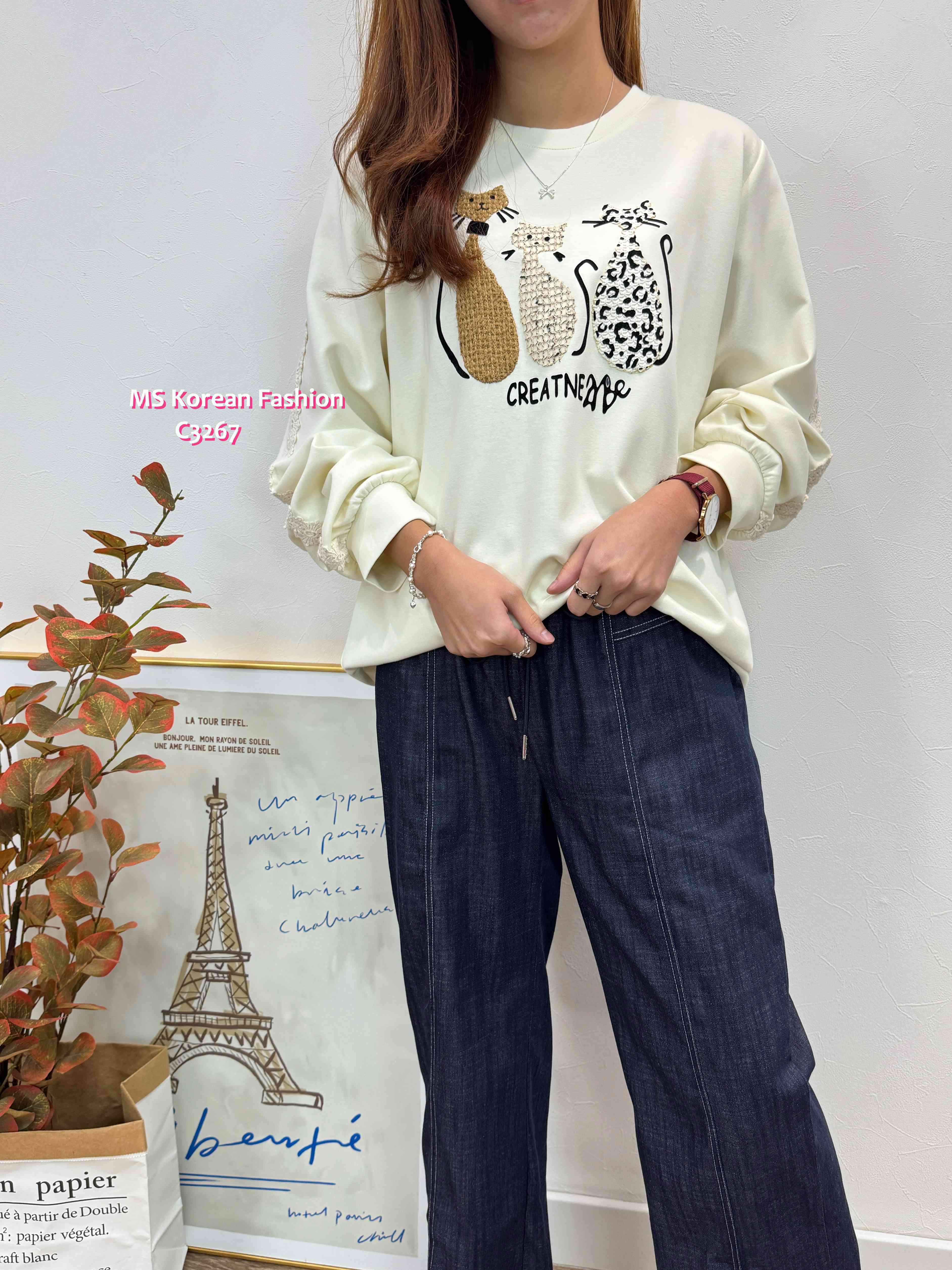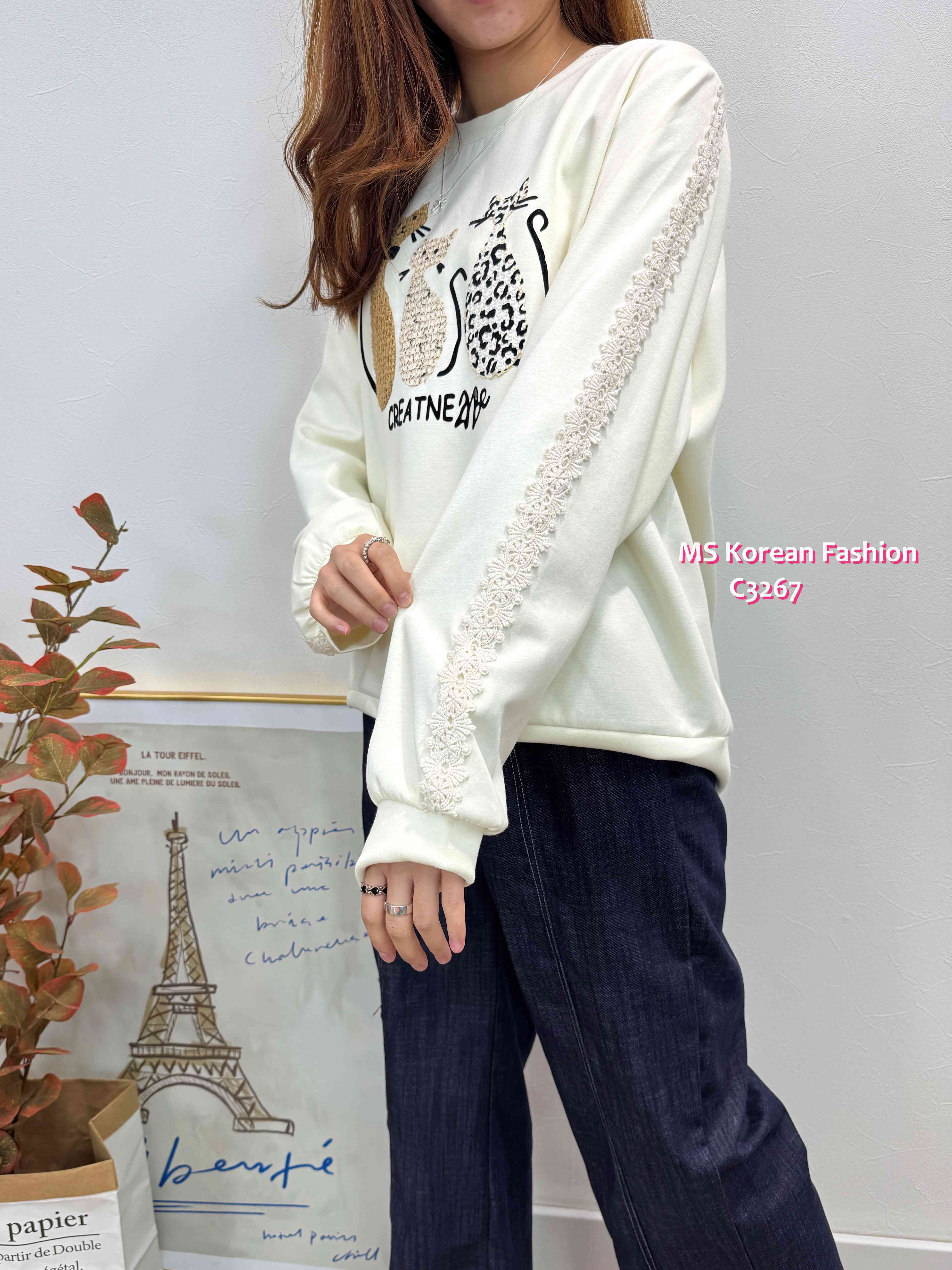 C3267 韓國🇰🇷可愛貓咪花邊袖top