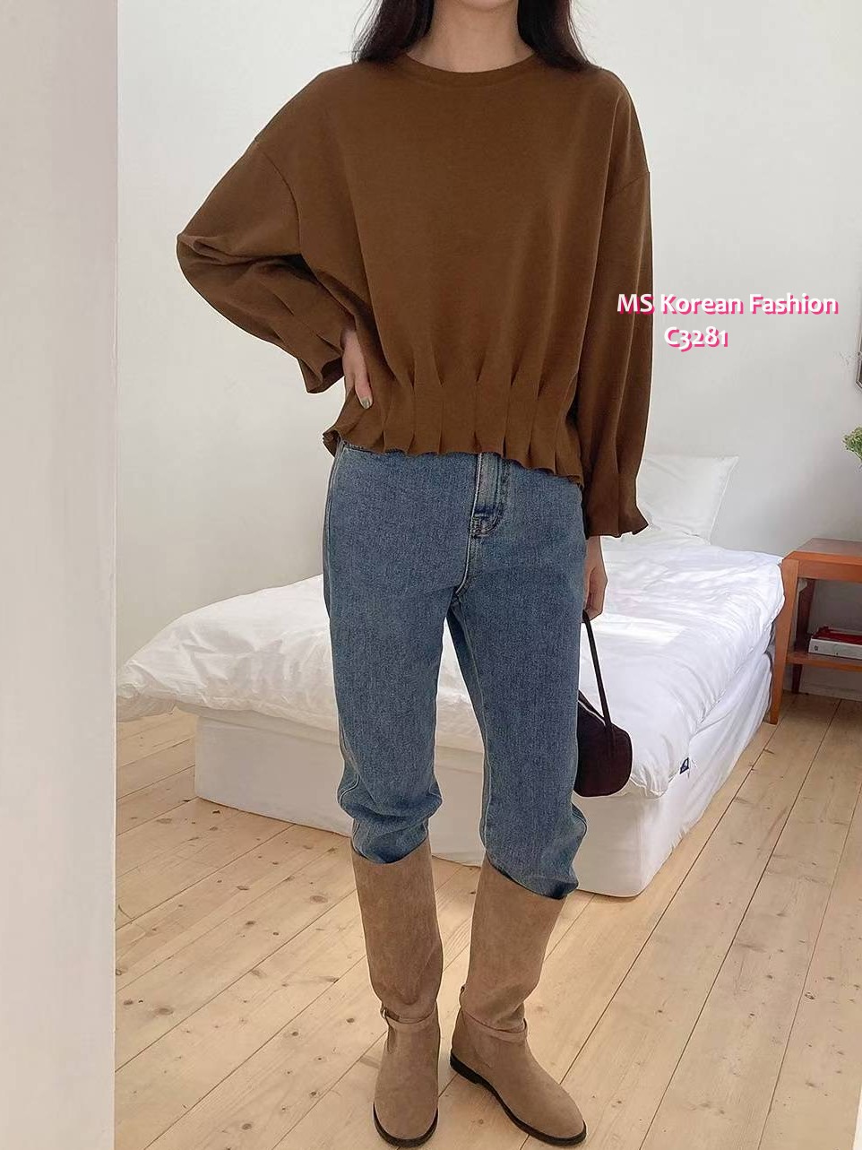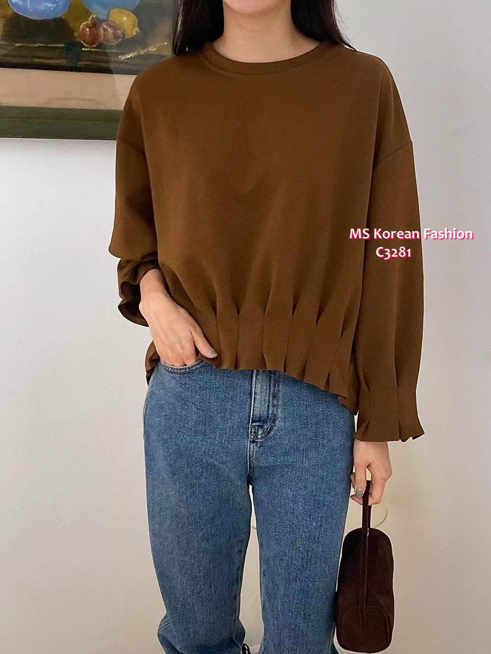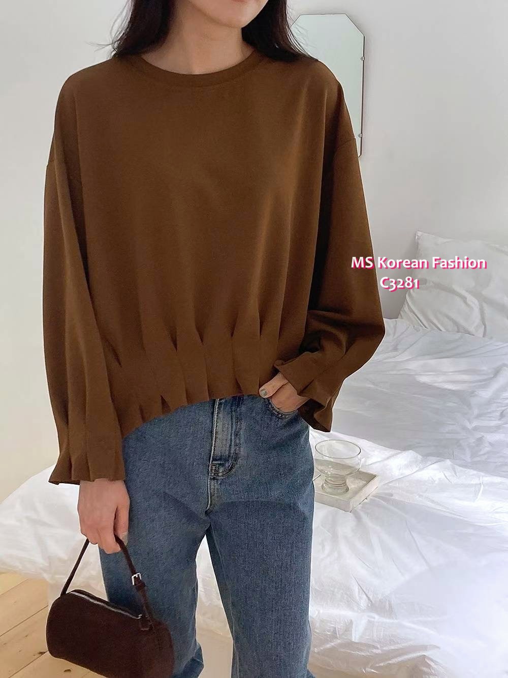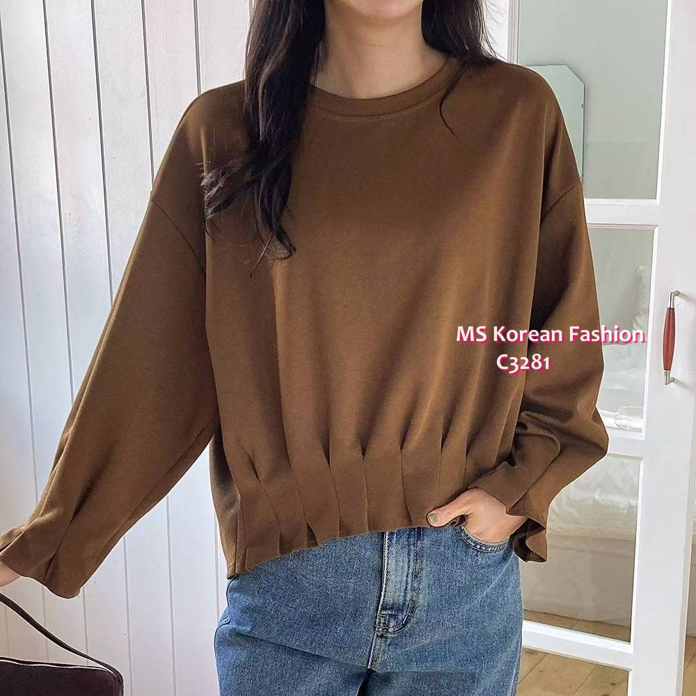 C3281 韓國🇰🇷淨色皺摺衫腳top