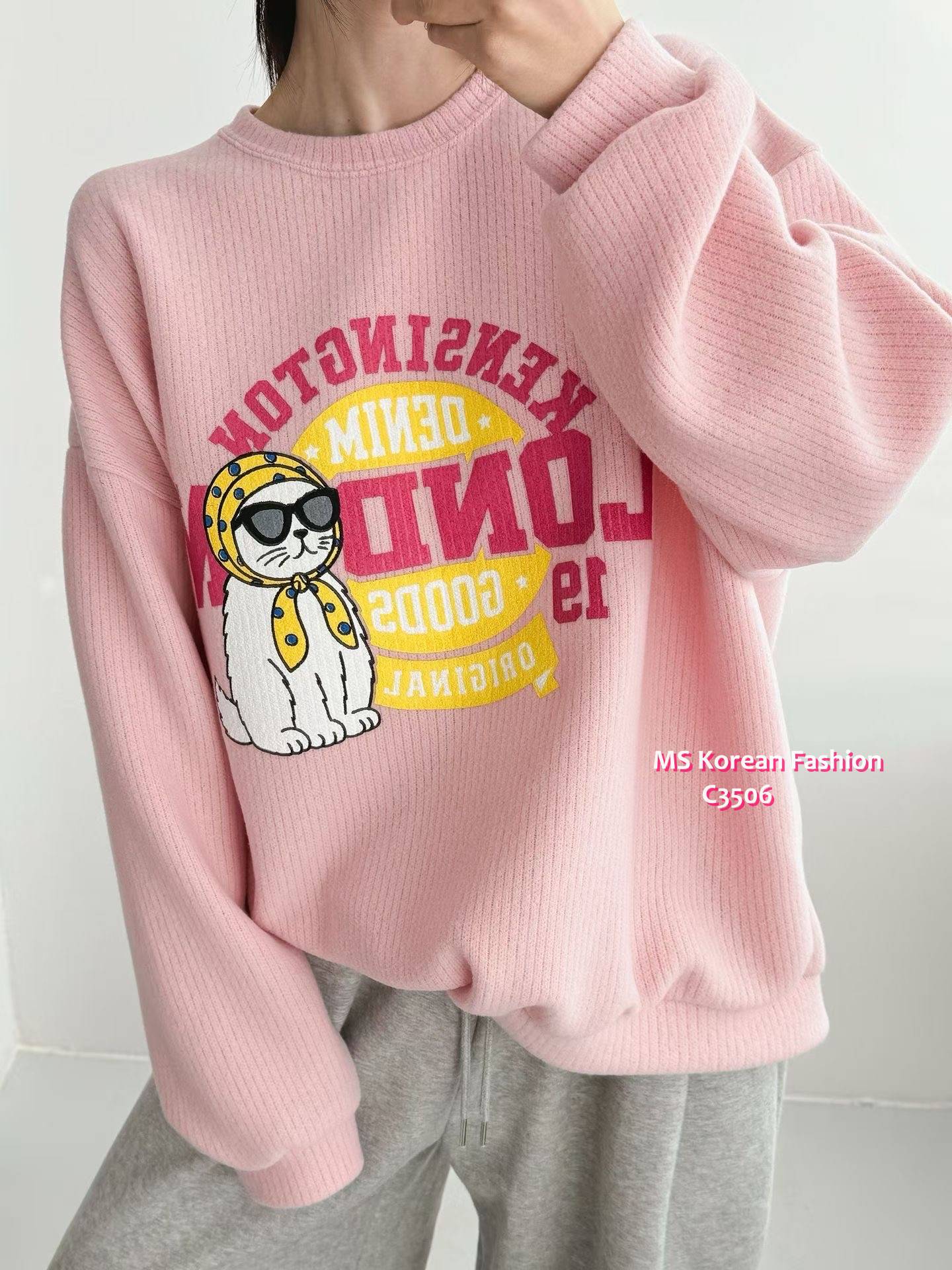 [訂貨約7-10個工作天] 💰💞Happy Price: $189 可愛貓咪字母top colour靚到叮一聲🥰 暗直紋料無加絨毛底架 鬆身款勁舒服 假日休閒之選✌ 粉、灰、黑 3色 尺寸 胸52"/長29" 📫1件加$15包順豐站/自助櫃,2件包順豐 📱查詢及Order可Inbox或Whatsapp 6317 3061