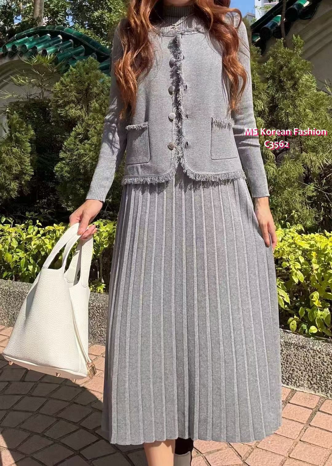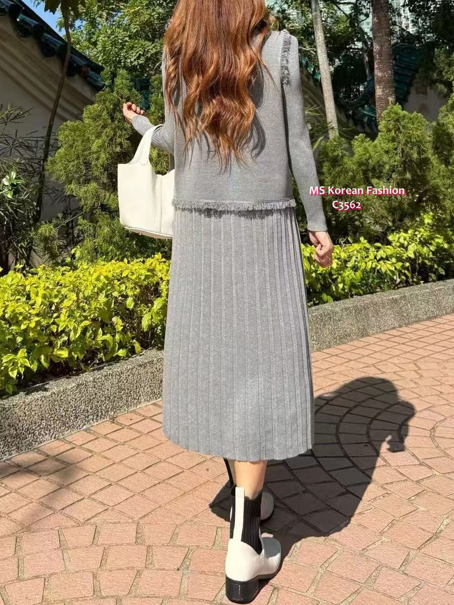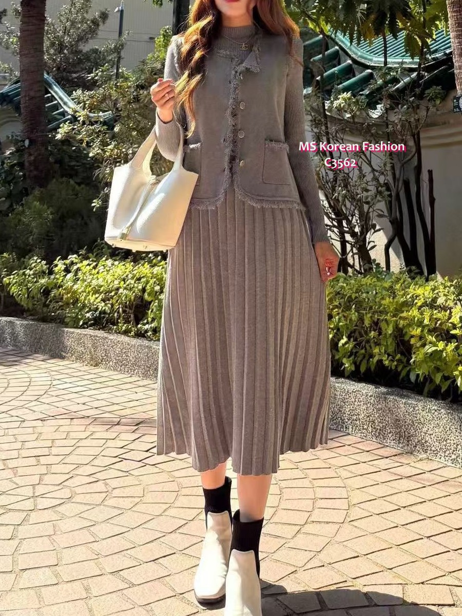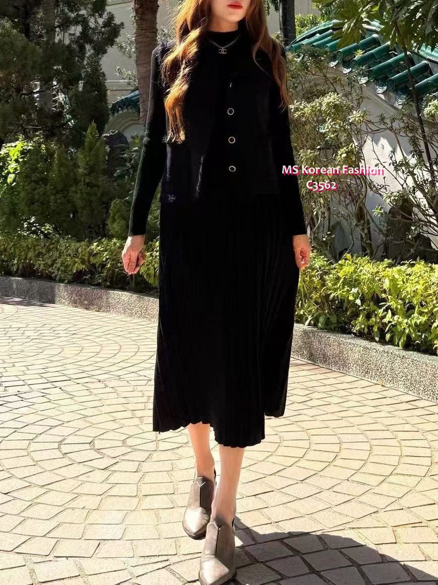 C3562 韓國🇰🇷百摺連身裙+背心外套Set