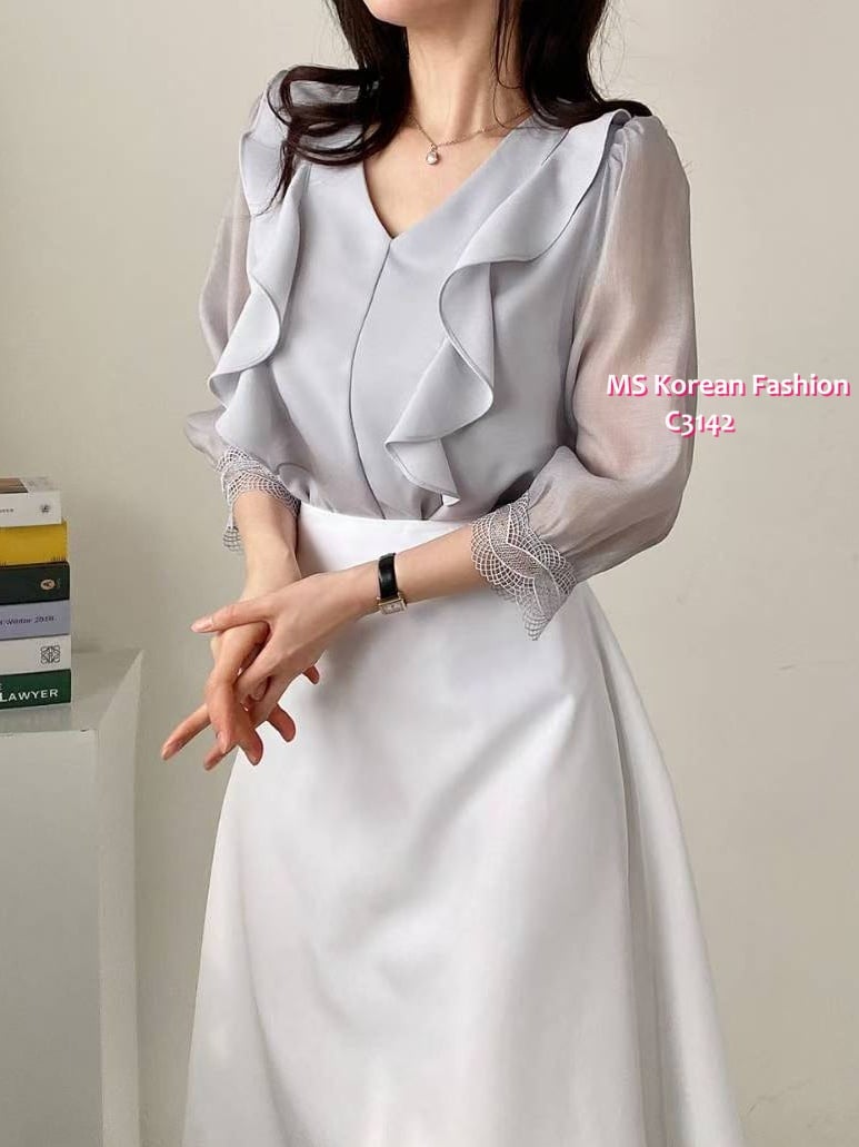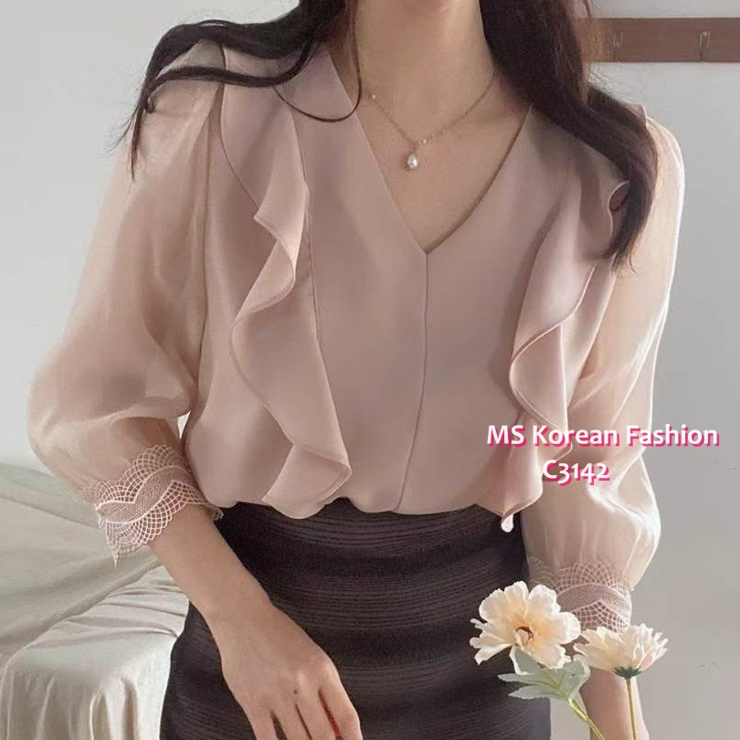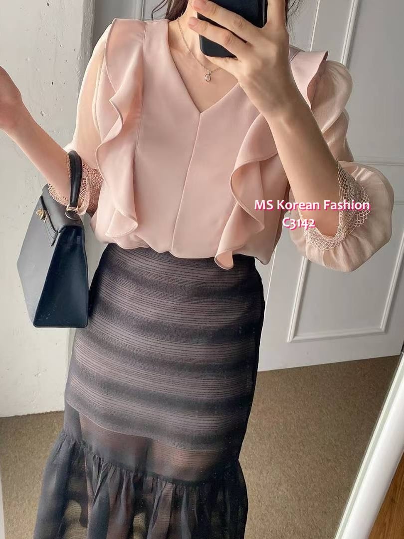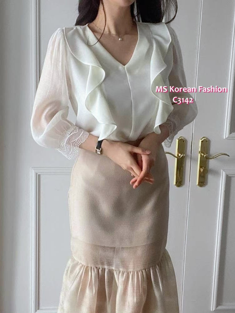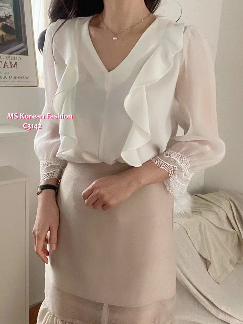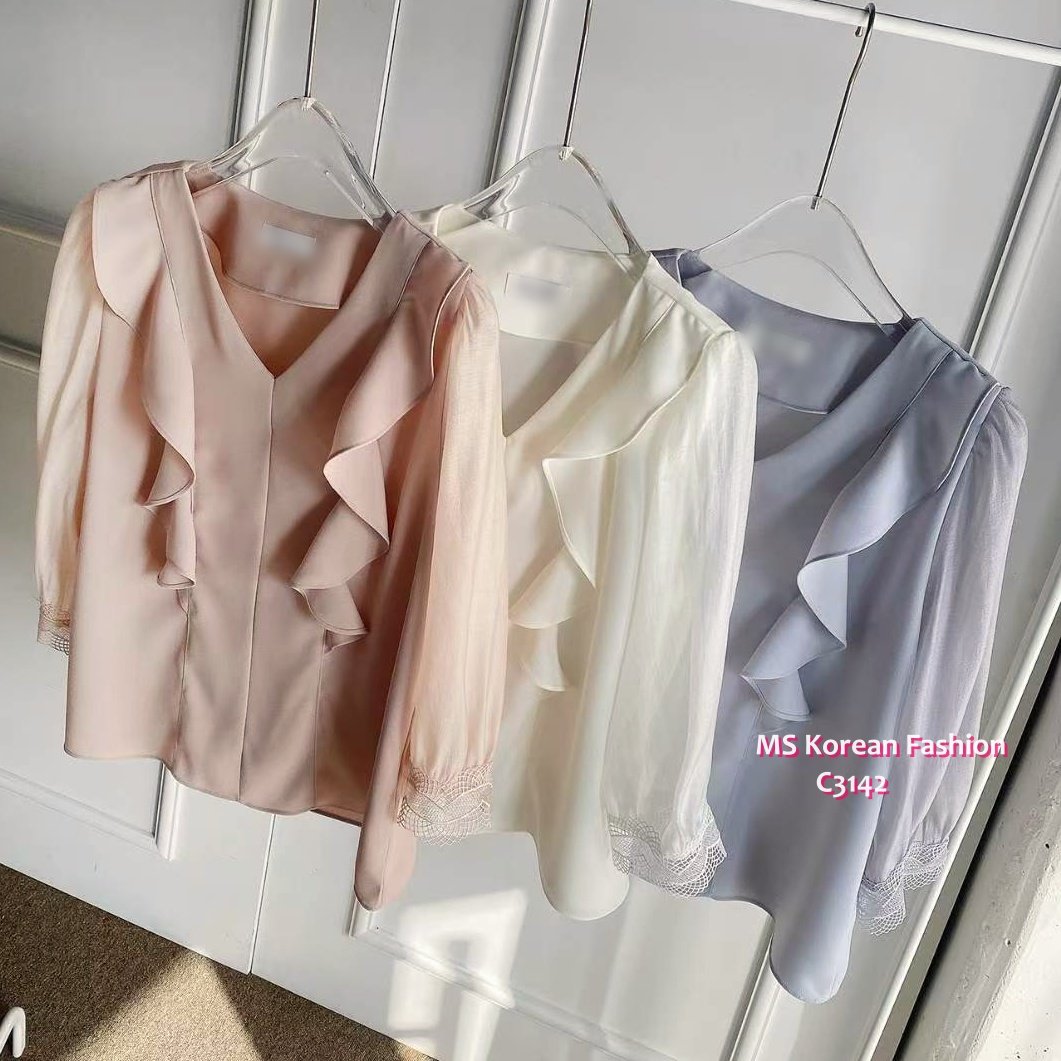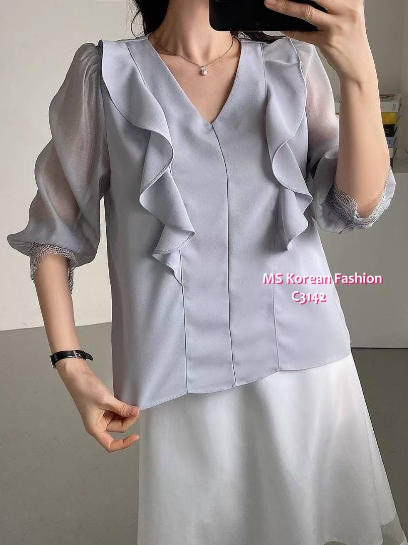 [訂貨約7-10個工作天] 💰💞Happy Price: $279 高質靚料V領top V領cutting露下鎖骨顯瘦D😻 兩行ruffle點綴巧令令 清清地又有款👍 杏、白、灰藍 3色 尺寸 胸40"/長22" 📫1件加$15包順豐站/自助櫃,2件包順豐(順豐站/自助櫃/工商/住宅) 📱查詢及Order可Inbox或Whatsapp 6317 3061