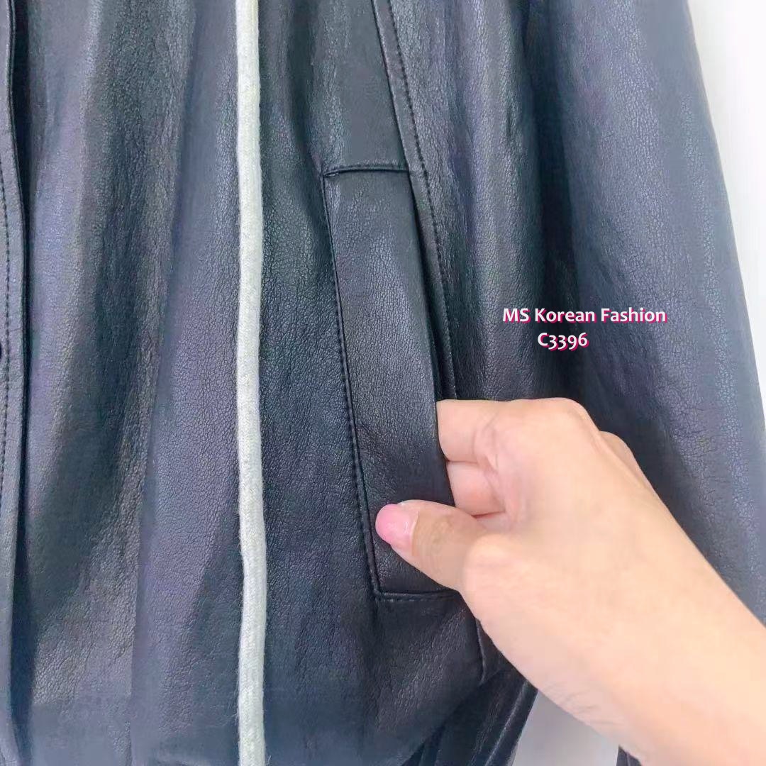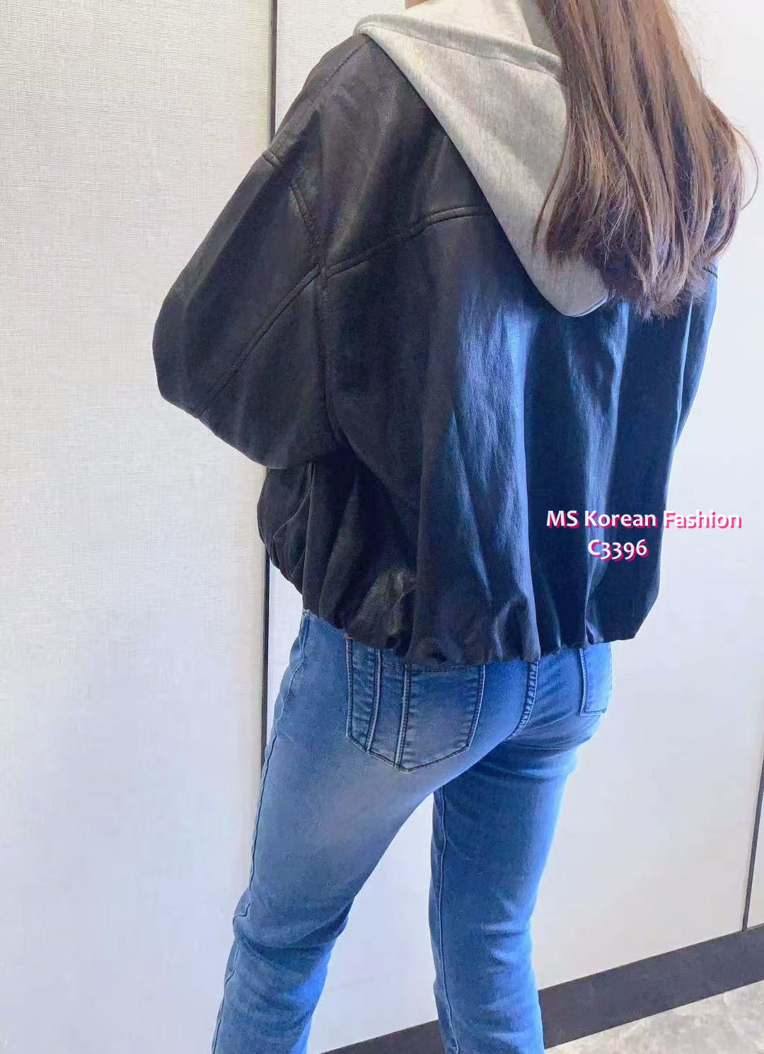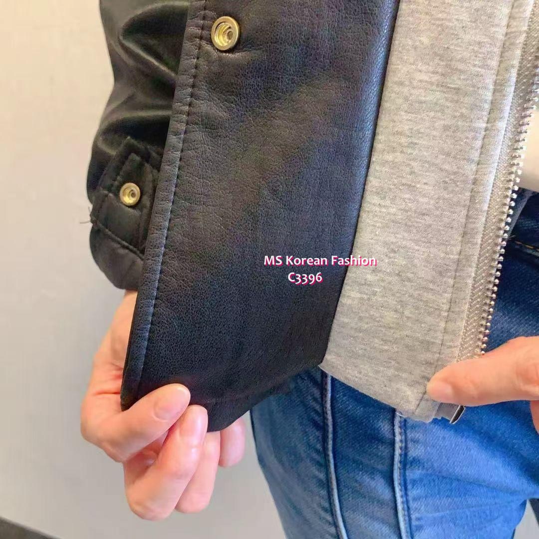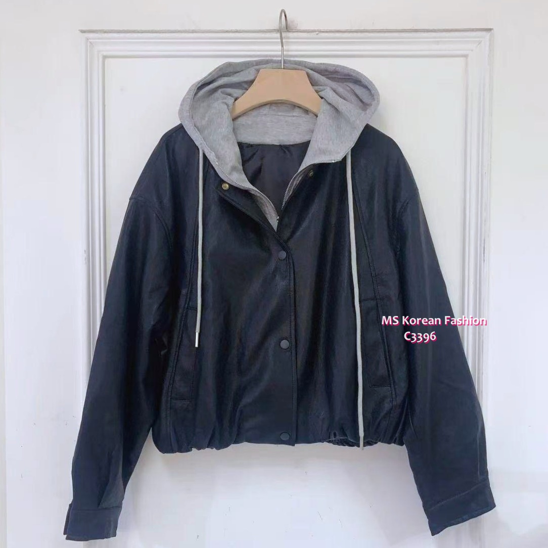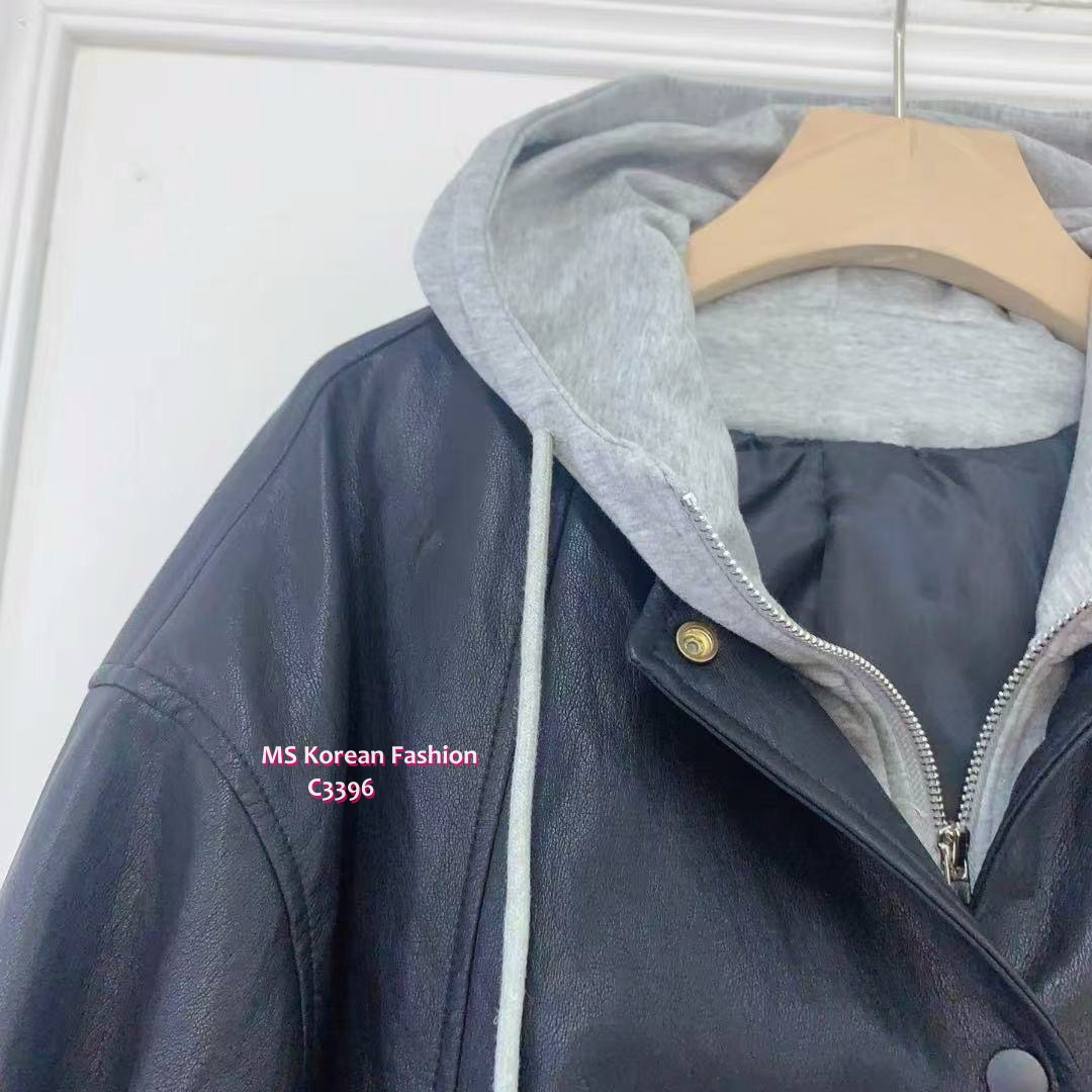 C3396 韓國🇰🇷拼衛衣帽仿皮外套