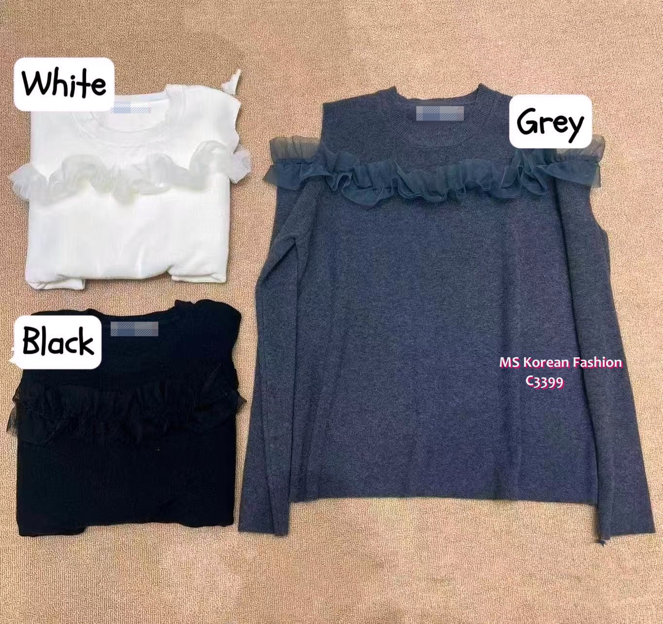 [訂貨約7-10個工作天] 💰💜$199, $189 for vip 勁靚ruffle花邊top 露下膊頭仔stylish得黎又夠lady🥰 黑、白、灰 3色 尺寸 胸38">拉開50"/長22" 📫1件加$15包順豐站/自助櫃,2件包順豐(順豐站/自助櫃/工商/住宅) 📱查詢及Order可Inbox或Whatsapp 6317 3061