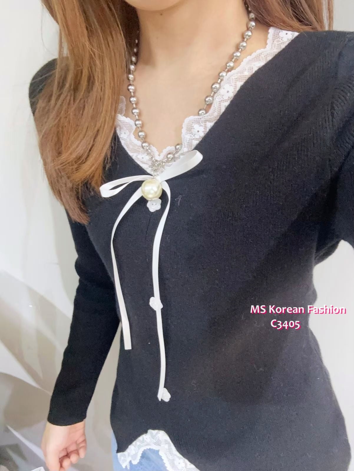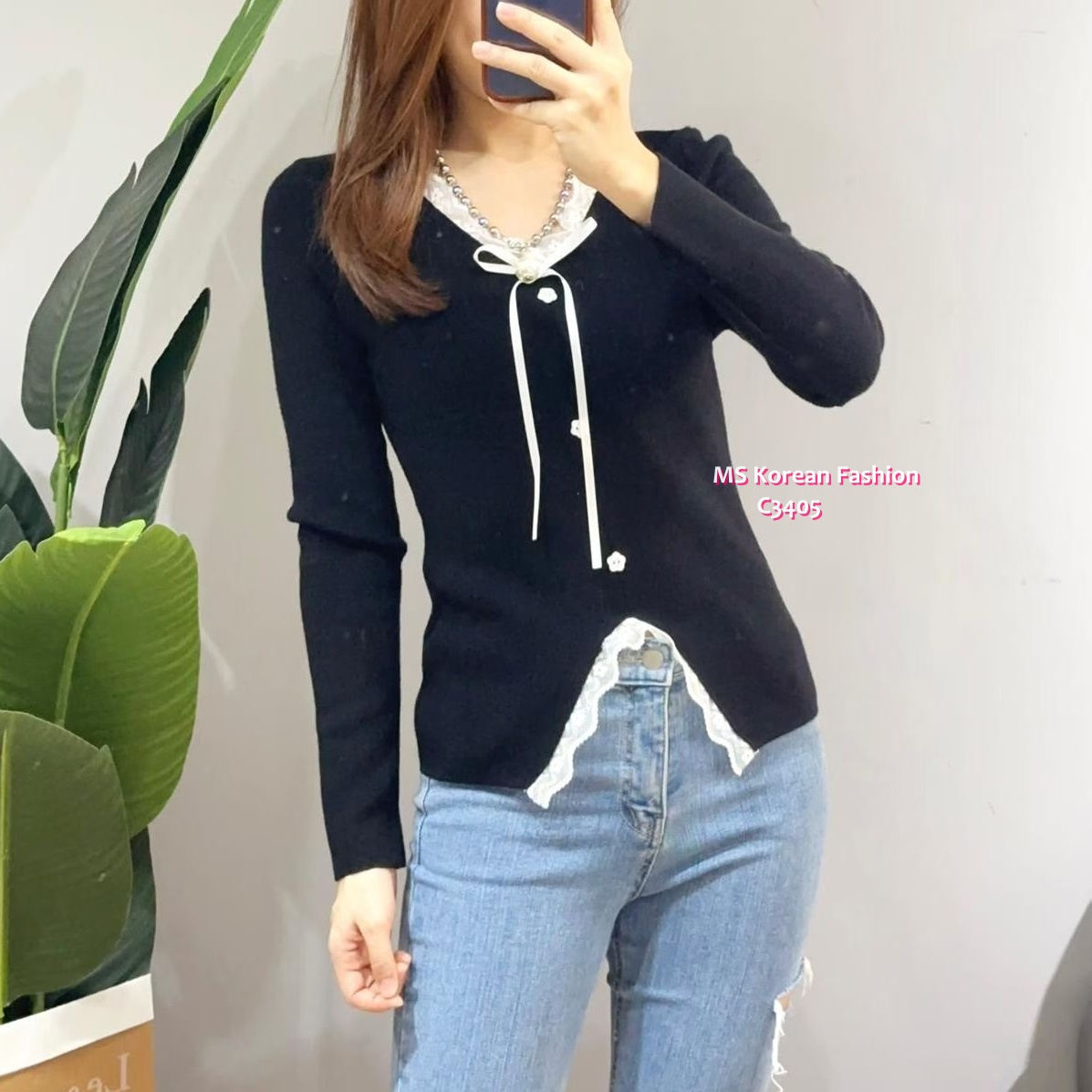 C3405 韓國🇰🇷V領lace邊top