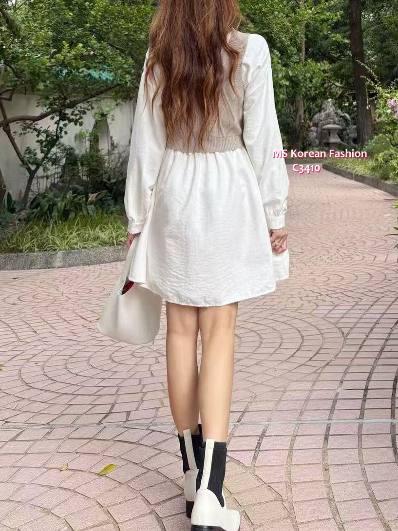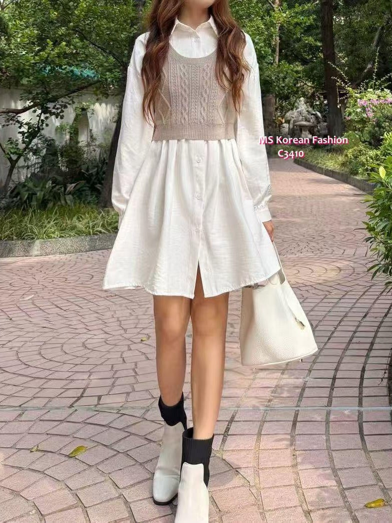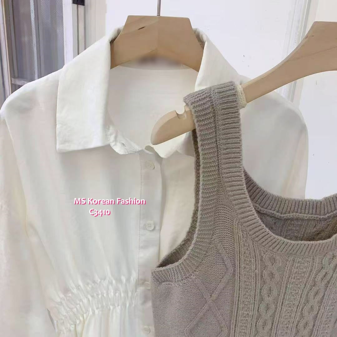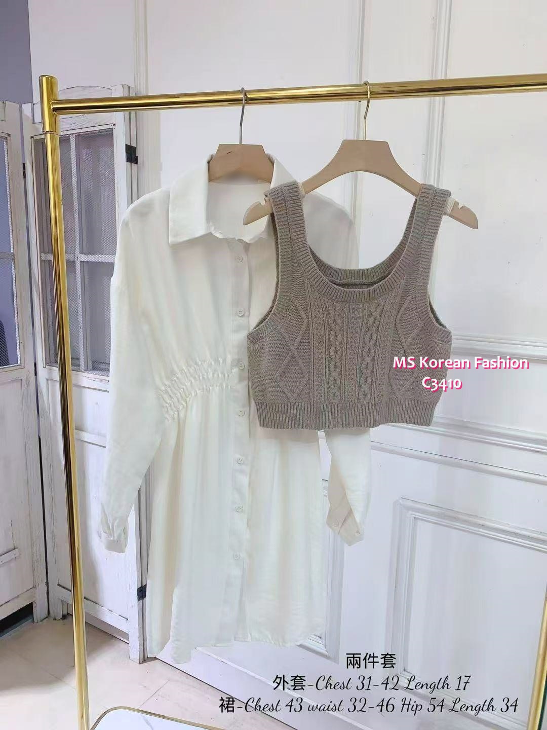 [訂貨約7-10個工作天] 💰💞Happy Price: $249 一套兩件: 恤衫型ops+小背心 反領修腰恤衫連身裙👗 加埋麻花紋針織背心 全套出擊或分別配搭都好睇架😎 尺寸 背心 胸31">拉開42"/長17" Ops 胸43"/腰32">拉開46"/坐圍54"/長34" 📫1件加$15包順豐站/自助櫃,2件包順豐(順豐站/自助櫃/工商/住宅) 📱查詢及Order可Inbox或Whatsapp 6317 3061