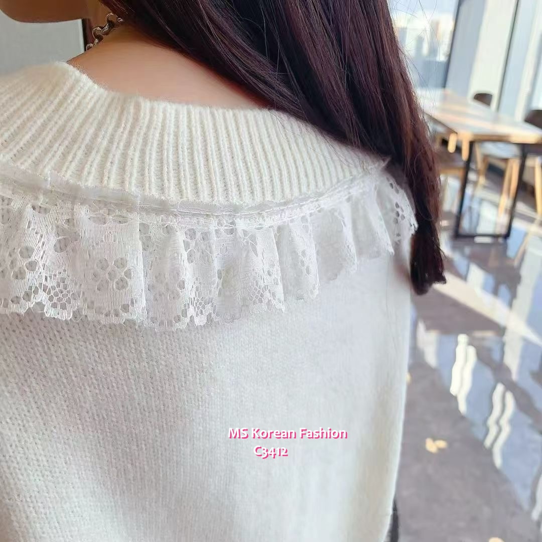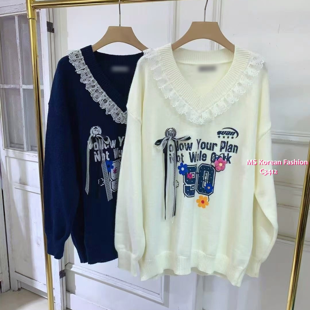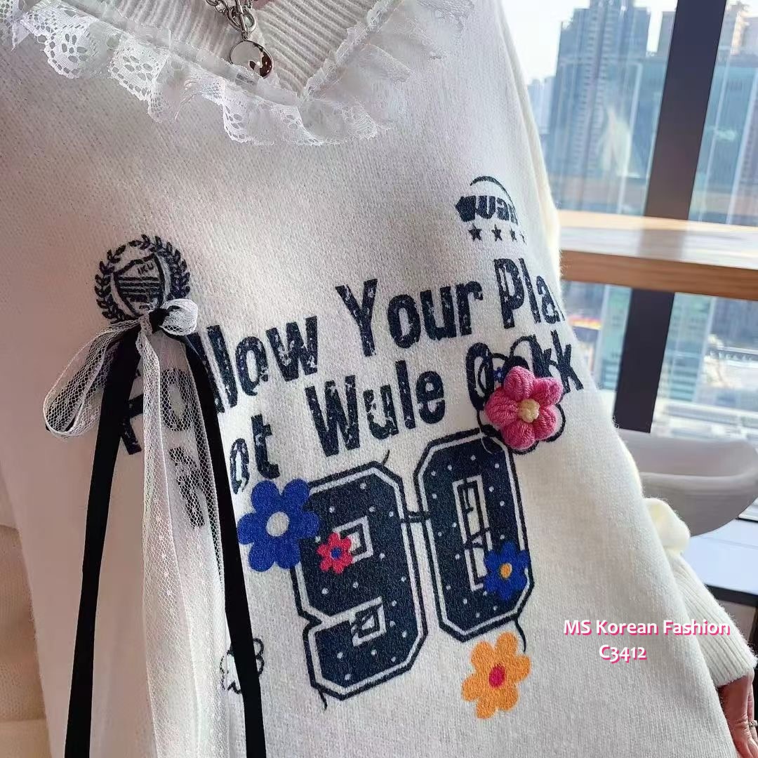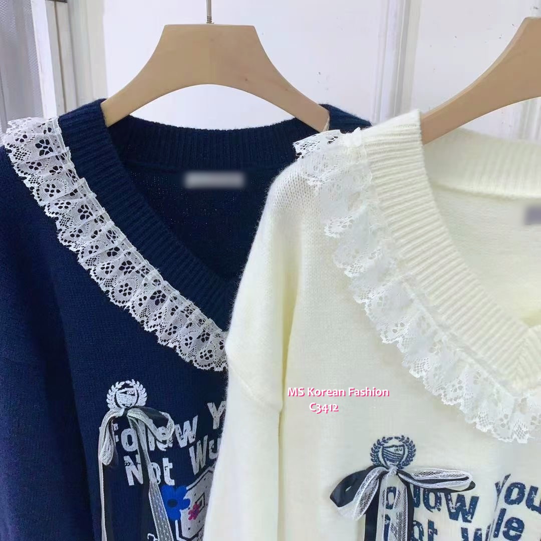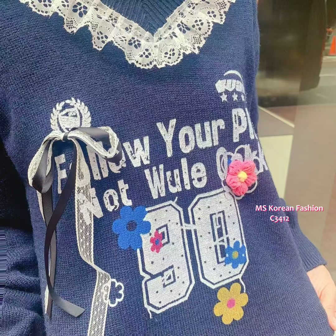 C3412 韓國🇰🇷靚print V領lace top
